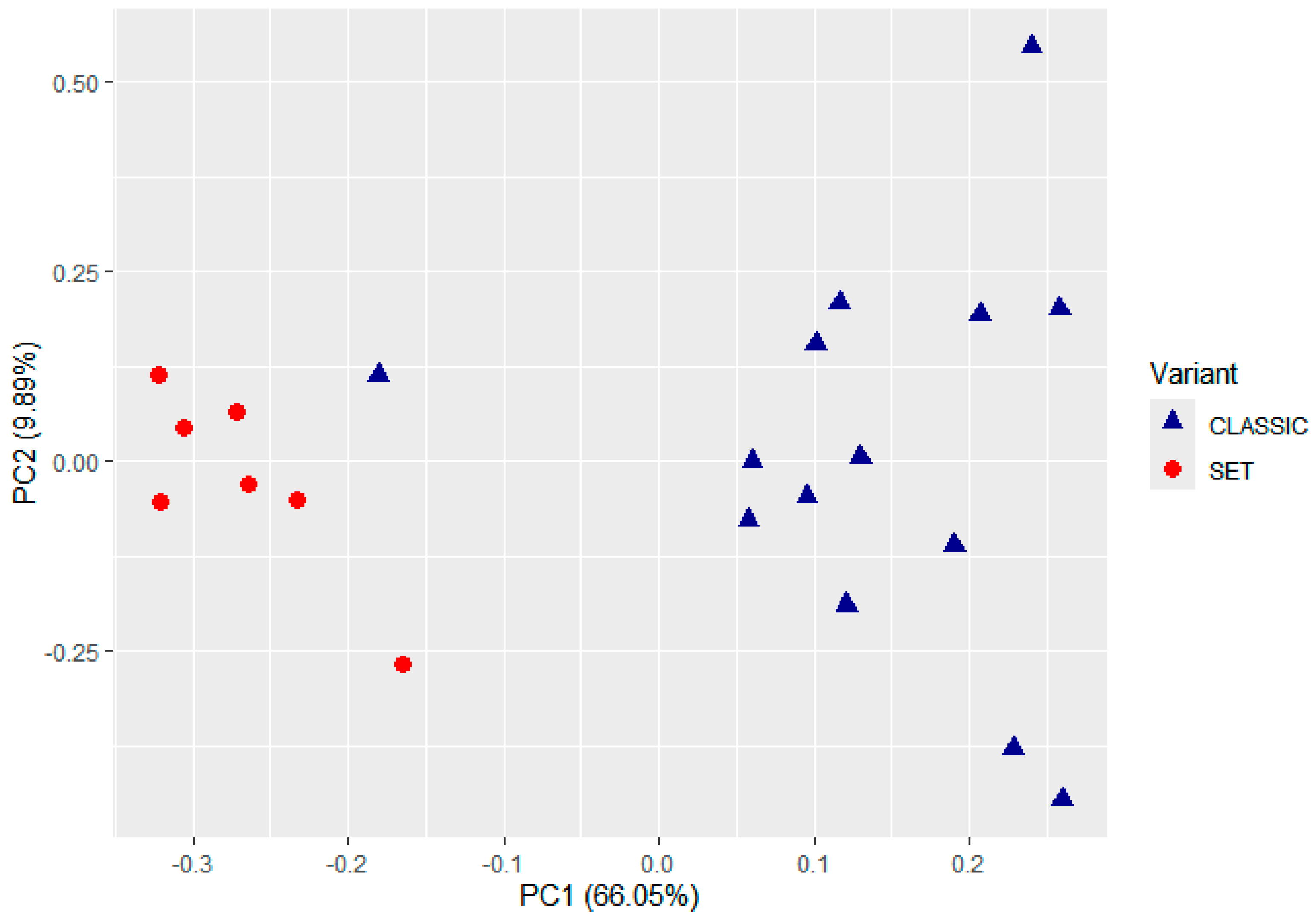 Figure 2. Principal component analysis of the TME gene expression profiles from 21 HGSC tumors profiled with the 770-gene panel. Red dots indicate SET cases (n = 7) and blue dots indicate classic cases (n = 14). The analysis was entirely unsupervised with respect to morphology, yet the two groups show an evident partial separation in the PCA plot. Unsupervised, raw display on normalized counts; symbol size and legend were enhanced for clarity. No inferential thresholds are derived from PCA.