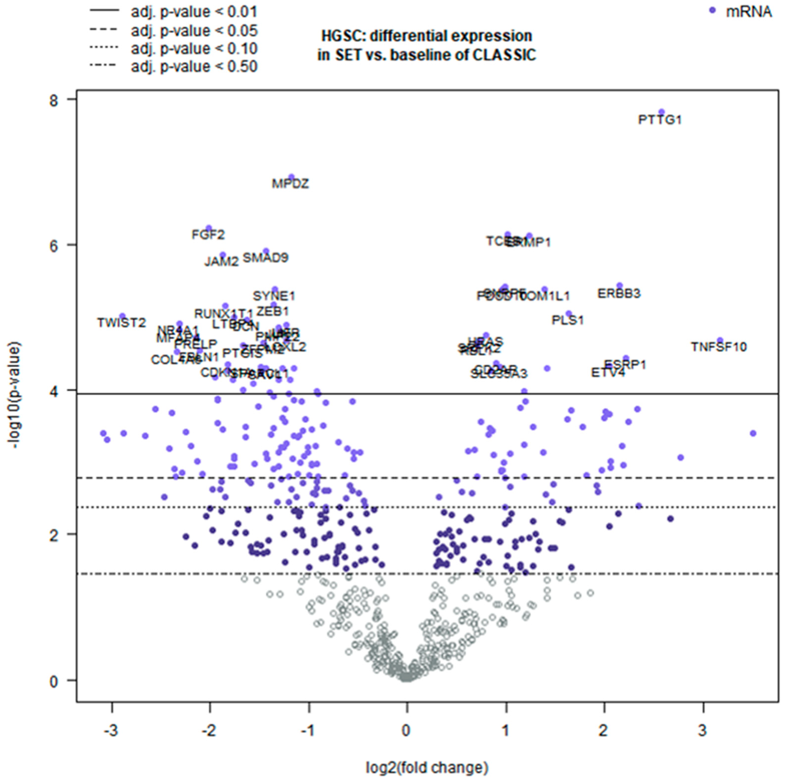 Figure 3 (volcano plot) illustrates the overall differential expression profile, and Figure 4 shows a heatmap of the top genes that most strongly distinguish SET-associated vs. classic-associated TME profiles (DEGs, q < 0.01). These molecular patterns are intriguing but require validation through functional studies and larger patient cohorts before clinical implications can be drawn.