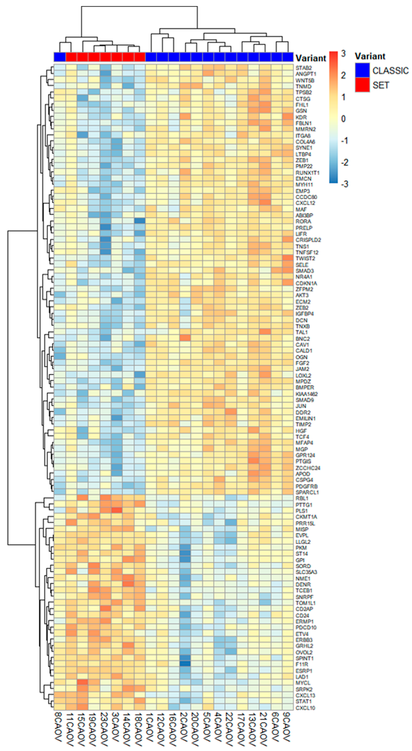 Figure 4. Clustering of HGSC cases by expression of the top differentially expressed genes (DEGs, q < 0.01). The heatmap displays z-score normalized expression for the most significant DEGs, with each column representing a tumor sample (red labels = SET, n = 7; blue labels = classic, n = 14). Unsupervised hierarchical clustering based on these top TME-associated genes largely separates the SET-pattern tumors (right cluster) from the classic tumors (left cluster), underscoring the apparent gene expression dichotomy between the two morphologies. Unsupervised clustering for visualization; highlighted features correspond to FDR-adjusted q-values. 95% CIs are provided in Table 1.