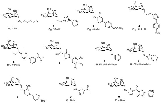 Abdu-Allah et al. also evaluated thiomannosides and showed that their activity was primarily influenced by the nature of the aryl or heteroaryl aglycone, and that compounds 7 and 8 (Figure 2) had superior affinity and inhibitory effects then the reference ligand 1 [30].