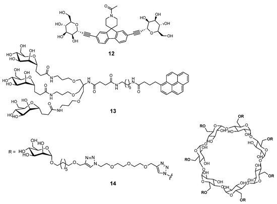 Structures harboring di-, tri-, hepta- and dendrimetic α-mannopyranosides 12–14 shown in Figure 3 are also very potent FimH antagonists [21], while the divalent C-linked mannopyranoside EB8018/Sibofimloc 12 which entered Phase IIa clinical trials against Crohn’s disease [33].