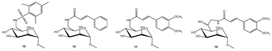 Furthermore, mannoheptose derivatives bearing cinnamide and sulfonamide groups were prepared by elongating the sugar backbone, with the aim of liberating the O6 position for potential hydrogen bonding with Ser23. However, compounds such as 18 did not exhibited improved affinity, even though (6S)-mannoheptose derivatives demonstrated higher inhibitory activity than methyl α-d-mannoside [41].