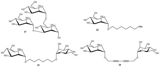 Poláková et al. evaluated antifungal activities of selected alkyl and (thio)dodecyl hexopyranosides based on d-glucose, d-galactose, N-acetyl d-glucosamine, and d-mannose. Treatment of C. albicans biofilms with (thio)alkyl glycosides led to a marked reduction in fungal cell proliferation, with activity dependent on glycoside structure and concentration. The relative potency of the tested derivatives against the azole-sensitive strain (GalOC12 > GlcOC12 ≈ ManOC12 > GlcNAcOC12) differed from that observed for the multiazole-resistant strain (GlcOC12 > ManOC12 ≈ GalOC12 > GlcNAcOC12) [111].