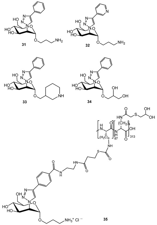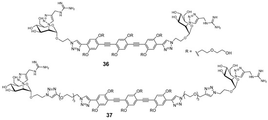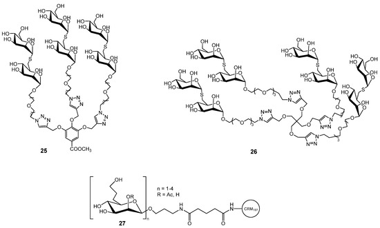 To exploit the cluster glycoside effect, multivalent mannoside derivatives were also developed. Since replacing the glycosidic oxygen with sulfur increases resistance to chemical and enzymatic hydrolysis, Wimmerová, Borbás and co-workers synthesized multivalent thiomannosides (Figure 7) with an (α1→2)-thio-linked mannobioside mimic functionalized with an azide-bearing aglycone, which was subsequently conjugated to various multivalent scaffolds via copper-catalyzed azide–alkyne cycloaddition. The methyl gallate-based cluster 25 and pentaerythritol-based glycoclusters 26 showed only slightly higher inhibition potency than αMeMan (relative potency 1.3), whereas compound 14 exhibited more than double the activity [49].