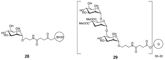 Multivalent mannose derivatives were also evaluated for their potential application in anti-B. pseudomallei and anti-B. mallei vaccines. 6-Deoxy-d-manno-heptopyranose and its β-(1→3)-linked oligomers 27 (Figure 7), polysaccharides common to B. pseudomallei and B. mallei, were prepared. Synthetically, the most challenging task was the preparation of β-mannosidic linkages within the oligosaccharides, which was achieved with high stereoselectivity through hydrogen-bond-mediated aglycone delivery. They were used for subsequent conjugation to the carrier protein CRM197, enabling immunological evaluation. These glycoconjugates elicited strong IgG antibody titers and robust T cell–dependent immune responses in mice [50]. Another example of mannose targeted delivery system is amphiphilic diblock copolymer, poly(ethylene oxide)-b-poly(ε-caprolactone) (PEO-b-PCL), functionalized with a terminal mannose group. The mannose moiety was subsequently introduced via quaternization of the PEO chain end with a brominated mannose derivative. These amphiphilic copolymers self-assembled into uniform spherical micelles with the mannose units on the micelle surface that served for the binding of BC2L-A lectin. The binding thermodynamics confirmed selective interaction, highlighting the potential of these micellar systems in targeted drug delivery and vaccine applications [51].