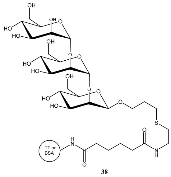 C. albicans strains can be classified into serotypes A and B, and further distinguished by antigenic factors 1, 4, 5, 6, and 13b. Most of these antigenic factors are composed of β-mannan chains, which differ in how they are attached to the α-mannan side chains of the cell wall. Consequently, the (1→2)-β-mannans located at the nonreducing ends of phosphomannan oligosaccharide side chains represent major antigenic determinants [112]. A minimal β-mannan disaccharide epitope from C. albicans that can elicit protective antibodies was identified and it was confirmed that a disaccharide or trisaccharide is sufficient for immune recognition and protection. Therefore, simple disaccharide or trisaccharide conjugates were linked to tetanus toxoid (TT) or bovine serum albumin (BSA) (Figure 12) [113].