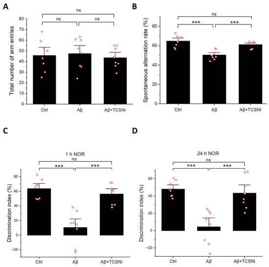 Effect of TCSNI applications on mice’s behavioral performance. The recovery effects of TCSNI treatment on Aβ-induced recognition impairments were assessed through (A) the total number of arm entries and (B) the spontaneous alternation index in the Y-maze test, and (C) the discrimination index with intertrial intervals of 1 h and (D) 24 h in the NOR maze test. Data are presented as mean ± standard error of the mean. Each red circle represents one mouse. Statistical significance was determined using one-way analysis of variance (ANOVA) followed by Tukey’s post hoc test. (n = 8 in each group). Significance levels between the indicated groups are denoted as *** p < 0.001, while non-significant differences are labeled as ns.