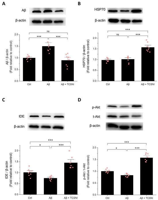 Effect of TCSNI applications on the expression levels of Aβ, HSP70, IDE, and p-Akt in the hippocampus. Representative Western blots and the quantifications of (A) Aβ, (B) HSP70, (C) IDE, and (D) p-Akt are shown to assess the anti-Aβ effect in the hippocampus. The protein levels of Aβ, HSP70, and IDE were normalized to β-actin, while p-Akt was normalized to t-Akt to accurately reflect the phosphorylation level relative to total Akt expression. Each relative expression level was compared to the control and expressed as a fold change relative to the control. Data are presented as mean ± standard error of the mean. Each red circle represents one mouse. Statistical significance was determined using one-way ANOVA followed by Tukey’s post hoc test. (n = 8 in each group). Significance levels between the indicated groups are denoted as * p < 0.05 and *** p < 0.001, while non-significant differences are labeled as ns.