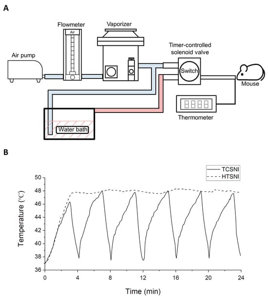 Experimental design and setup of TCSNI: (A) The TCSNI system is depicted, which provides inhaling mildly heated air for cyclic thermal stimulation. (B) Actual air temperatures entering the mouse’s nasal cavity were recorded using a K-type needle thermocouple throughout the exposure durations of TCSNI and HTSNI treatments.