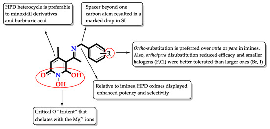 5-(1-(((2,4-dichlorobenzyl)oxy)imino)ethyl)-1,6-dihydroxy-4-methylpyridin-2(1H)-one (31) was synthesized from compound (10) according to the general procedure. Green solid (93.6 mg, 50%), Rf 0.20 (AcOEt), mp: 145–150 °C, 1H NMR (400 MHz, DMSO) δ 7.65–7.39 (m, 3H, Ar), 5.48 (d, J = 19.7 Hz, 1H, CHC=ON), 5.09 (d, J = 50.9 Hz, 2H, OCH2), 2.00 (d, J = 28.0 Hz, 3H, CH3C=N), 1.88 (d, J = 6.2 Hz, 3H, CH3). 13C NMR (101 MHz, DMSO) δ 132.50 (C3’), 129.22 (C5’), 128.28 (C6’), 92.19 (C3), 71.56 (OCH2), 20.42 (7-CH3), 16.42 (4-CH3). Anal. Calcd for C15H14Cl2N2O4: C, 50.44; H, 3.95; N, 7.84. Found: C, 50.48; H, 3.99; N, 7.88.