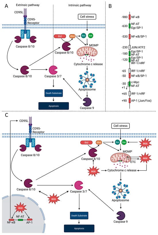 Apoptosis. (A) Extrinsic vs. intrinsic pathways of apoptosis. Activation of different caspases leads to degradation of various cellular structures. (B) Schematic illustration of CD95L Promotor. In red, binding sites of redox-sensitive transcription factors; in green, binding sites of calcium-dependent transcription factors. (C) Influence of ROS and cell stress on apoptosis. AP-1 (Jun/Fos) = activator protein 1; Bak = Bcl-2 homologous antagonist/killer; Bax = Bcl-2-associated X protein; Bid = BH3 interacting domain death agonist; CD95L = CD95 (Fas) ligand; Egr/SP-1= early growth response/specificity protein-1; ETC = electron transport chain; FADD = Fas-associating death domain-containing protein; IRF-1/vIRF = interferon regulatory factor 1/viral interferon regulatory factor; JUN/ATF2 = JUN/Activating transcriptions factor 2; MOMP = mitochondrial outer membrane permeabilization; NF-AT = nuclear factor of activated T cells; NF-κB = nuclear factor kappa-light-chain-enhancer of activated B cells; ROS = reactive oxygen species; tBID = truncated BH3 interacting domain death agonist. This figure was created with BioRender (https://biorender.com); original files available on request.