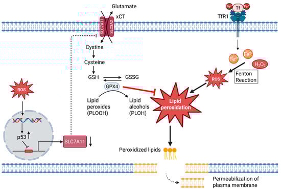 While the labile iron pool and H2O2 critically determine the oxidative burden that drives lipid peroxidation, the cell’s ability to counteract this threat depends on the availability of cysteine and glutathione. This protective axis is maintained by the cystine/glutamate antiporter system xCT, which fuels GSH synthesis and thereby enables GPX4 to detoxify lipid hydroperoxides [190,191] (Figure 4). Thus, system xCT activity indirectly sustains GPX4 function and protects against ferroptosis [181,183]. At the transcriptional level, oncogenic and stress pathways increase the expression of SLC7A11, a subunit of the transporter, to enhance resistance to ferroptosis. Conversely, p53 suppresses SLC7A11 expression, thereby promoting ferroptosis [192,193].