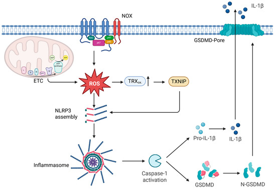 Pyroptosis. Mitochondrial ROS from electron leakage of the ETC and ROS generated from NOX promote NLRP3 inflammasome assembly and TRX oxidation. TRX oxidations leads to release of TXNIP, which binds NLRP3 and promotes inflammasome assembly. Inflammasome activation leads to further activation of caspase-1, which cleaves GSDMD and Pro-IL-1β. N-GSDMD oligomerizes in the plasma membrane to form pores, so that proinflammatory IL-1β can be released. ADP = adenosine diphosphate; ATP = adenosine triphosphate; Cyt c = cytochrome c; ETC = electron transport chain; GSDMD = gasdermin D; IL-1β = interleukin 1β; N–GSDMD = N-terminal gasdermin D; NLRP3 = NLR family pyrin domain containing 3; NOX = NADPH oxidase; Pro-IL-1β = Pro-interleukin 1β; RAC = RAC GTPase; ROS = reactive oxygen species; TRXox. = oxidized thioredoxin; TXNIP = thioredoxin-interacting protein. This figure was created with BioRender (https://biorender.com); original files available on request.