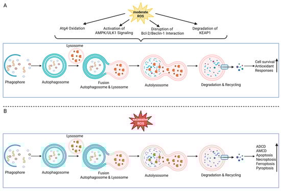 ROS—not only byproducts of metabolism but also potent signaling molecules—play a dual role in modulating autophagy. Under moderate oxidative stress, ROS can activate autophagy through multiple mechanisms, including oxidation and inactivation of autophagy-related protease 4 (Atg4), activation of AMP-activated protein kinase (AMPK)/Unc-51-like kinase 1 (ULK1) signaling, disruption of the Bcl-2/Beclin-1 interaction, and the autophagic degradation of Kelch-like ECH-associated protein 1 (KEAP1). Thereby Nrf2-mediated antioxidant responses are enhanced and survival is promoted [253,254] (Figure 6A). Conversely, autophagy serves as a negative feedback mechanism, selectively removing damaged, ROS-producing mitochondria via mitophagy or peroxisomes via pexophagy, thus mitigating oxidative stress and maintaining cellular redox homeostasis [253]. However, when ROS accumulation is excessive or prolonged, autophagy may shift from a cytoprotective process to a dysregulated, lethal form that directly contributes to cell death (Figure 6B). In transformed and cancer cells, sustained ROS exposure induces autophagic cell death, and inhibition of autophagy confers protection even in the absence of apoptosis, highlighting autophagy as a distinct death mechanism [255,256]. More broadly, excessive or uncontrolled autophagy can promote cell death by indiscriminate degradation of essential cellular components and organelles, a process defined as autophagy-dependent cell death (ADCD) or autophagy-mediated cell death (AMCD) [257,258].