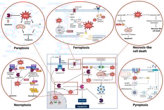 When cellular ROS levels exceed a critical threshold, they can trigger the activation of various forms of PCD/RCD. While classical apoptosis, an orchestrated, caspase-dependent process, remains the most extensively studied form, recent years have seen the identification of numerous alternative RCD modalities, each defined by distinct molecular mechanisms [7,8]. Among these are ferroptosis, an iron-dependent form of cell death characterized by lipid peroxidation [9,10,11], and pyroptosis, a lytic and pro-inflammatory form of cell death mediated by gasdermin-induced membrane pore formation [12,13,14,15,16,17]. In addition, necroptosis, a regulated necrotic process involving receptor-interacting protein kinase 3 (RIPK3) and mixed lineage kinase domain-like protein (MLKL) [18], and parthanatos, which is driven by poly(ADP-ribose) polymerase 1 (PARP1) [19,20].