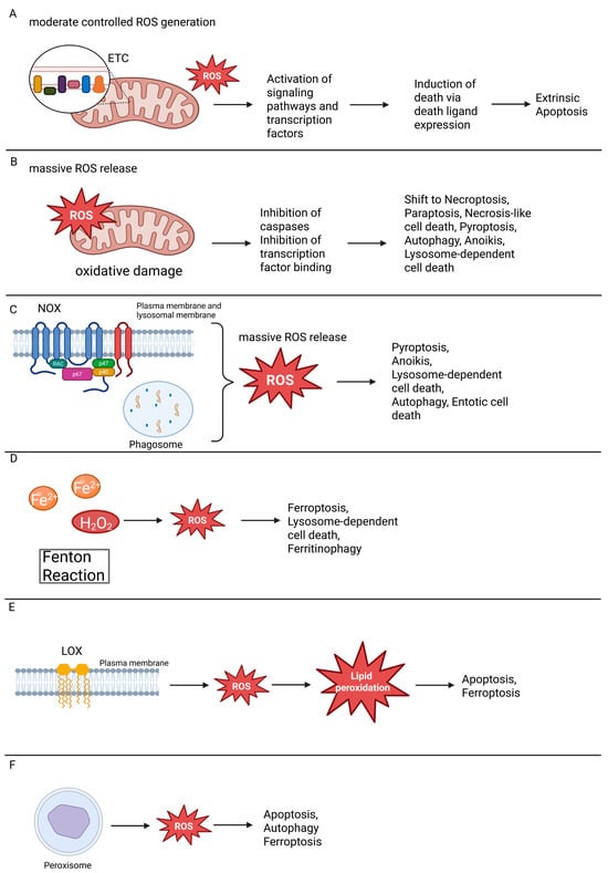 Other ROS-associated death pathways include paraptosis, marked by cytoplasmic vacuolization and mitochondrial swelling [6], lysosome-dependent cell death, where ROS promote lysosomal membrane permeabilization [21], and oxeiptosis, a recently described, non-inflammatory form of cell death triggered by high ROS concentrations and mediated via Kelch-like ECH-associated protein 1 (KEAP1) and phosphoglycerate mutase family member 5 (PGAM5)-dependent signaling [22,23]. In addition, an expanding repertoire of regulated cell death modalities such as anoikis [24], entosis [25,26], mitotic catastrophe [27], methuosis [28], cuproptosis [29], alkaliptosis [28], disulfidptosis [28], and others has been linked to redox imbalance. This diversity illustrates that ROS do not merely act within a few selected pathways but represent a common thread across almost the entire spectrum of RCD, influencing both their initiation and their inflammatory or non-inflammatory outcomes. A deeper understanding of ROS-mediated signaling pathways and their impact on distinct death programs is essential for the development of targeted therapies for diseases in which oxidative stress plays a pathogenic role, such as cancer, neurodegeneration, and chronic inflammation.