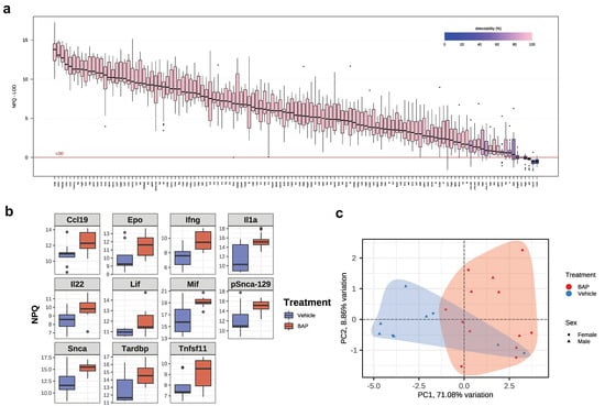 Identification of BaP-responsive serum proteins in MRL mice. (a) Boxplot of sample normalized protein quantification (NPQ) distributions by target relative to limit of detection (LOD). (b) NPQ levels, which indicate expression levels on the log2-scale, of indicated proteins in BaP-treated and control groups. (c) PCA plot showing the separation of BaP-treated and control groups.