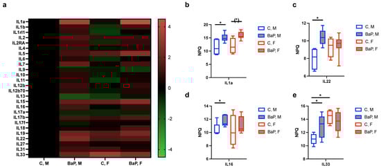 Interleukins (ILs) are a group of cytokines critical for mediating immune responses, whose imbalance strongly associates with autoimmune pathogenesis [,]. The NULISA panel detected 26 targets in the IL and IL-Receptor Families. The mean of the NPQ (NULISA Protein Quantification) levels, which indicates expression levels on the log2-scale, suggests the upregulation of various IL family proteins upon BaP stimulation (Figure 2a). The pro-inflammatory cytokine IL1a showed the most prominent increase upon stimulation, with an NPQ increase of 3.65 in male MRL mice, corresponding to a 12.58-fold change in protein levels (Figure 2b). Other significantly BaP-regulated ILs included IL22, with 5.37-fold increase in males; IL33, with 3.94-fold increase in males; and IL16, with 2.30-fold increase in males (Figure 2b–e), which all have known roles in immune activation [,,,].