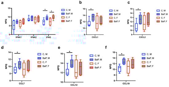 BaP regulation of IFN- and CXCL/CCL-family proteins in MRL serum. Normalized protein quantification (NPQ) levels of IFNA1, IFNA2 and IFNG (a), CXCL1 (b), CXCL2 (c), CCL7 (d), CCL12 (e) and CCL19 (f) in indicated mouse and treatment groups. C, control. BaP, BaP-treated. M, male. F, female. *, p < 0.05, Student’s t-test.