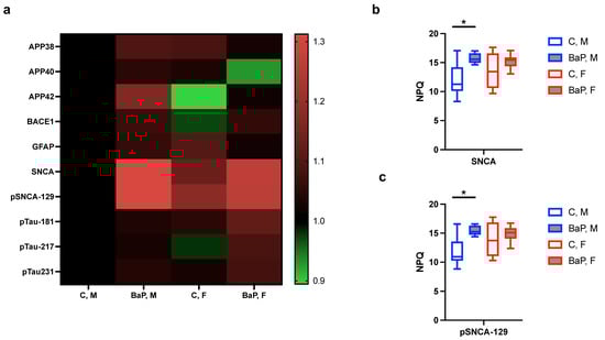 BaP regulation of blood markers for neurological disorder in autoimmunity. (a) Heatmap of individual neuronal blood markers in indicated mice and treatment groups, with the scale bar showing the fold-change in protein levels. (b,c) Normalized protein quantification (NPQ) levels of SNCA (b) and its phosphorylated form (c) in indicated mouse and treatment groups. C, control. BaP, BaP-treated. M, male. F, female. *, p < 0.05, Student’s t-test.