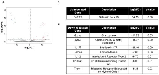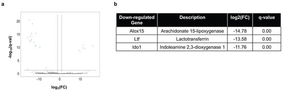 Transcriptomic study of the skin identified five upregulated and 16 downregulated genes with fold change > 2 and q-value < 0.05 (Figure 6a). Among them, three genes have known immune functions, which were all downregulated (Figure 6b).