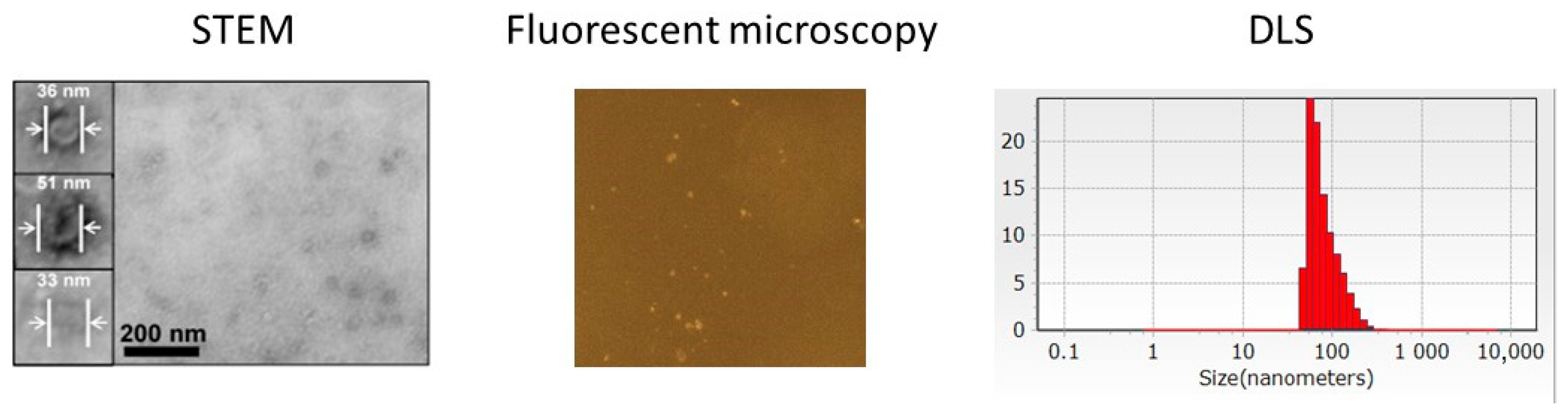 - Welsh, J.A.; Goberdhan, D.C.I.; O’Driscoll, L.; Buzas, E.I.; Blenkiron, C.; Bussolati, B.; Cai, H.; Di Vizio, D.; Driedonks, T.A.P.; Erdbrügger, U.; et al. Minimal information for studies of extracellular vesicles (MISEV2023): From basic to advanced approaches. J. Extracell. Vesicles 2024, 13, e12404, Erratum in: J. Extracell. Vesicles 2024, 13, e12451. https://doi.org/10.1002/jev2.12451. [Google Scholar] [CrossRef] [PubMed] [PubMed Central]