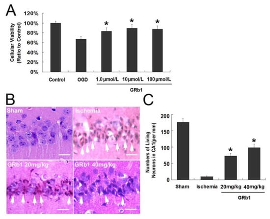 Protective effect of Ginsenoside Rb1 (GRb1) on both oxygen glucose deprivation (OGD)-induced cell death in SH-SY5Y cells and neuronal death in CA1 region caused by transient global ischemia. (A) MTT assay of cellular viability of SH-SY5Y cells. The reduction in the cellular viability at recovery 24 h following OGD treatment was counteracted by administration of GRb1; (B) Histological images of the CA1 neurons stained with hematoxylin and eosin 40×. The dead neurons indicated by arrows presented condensed polyglonal nuclei and pink cytosols; (C) Statistical analysis of living neurons in the CA1 region. Scale bar = 20 µm. * p < 0.01 versus OGD group. Each experiment was performed four times.