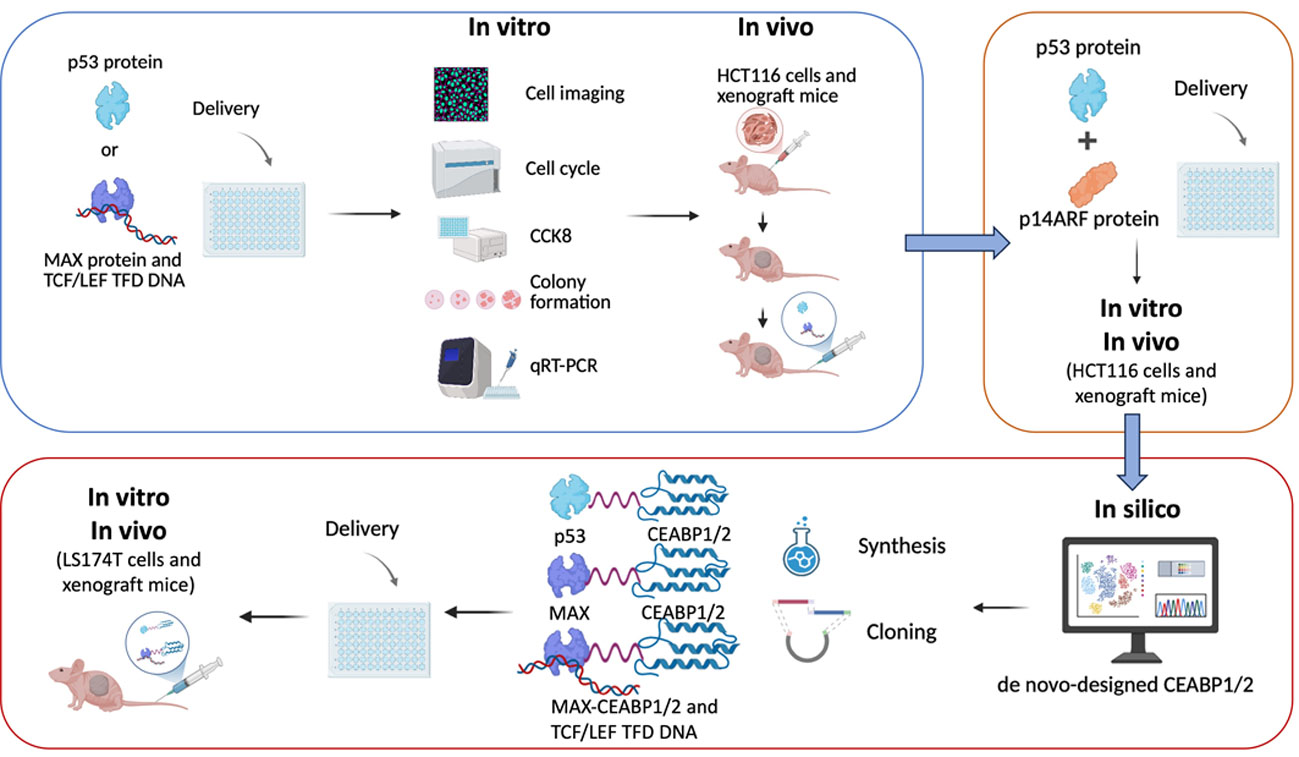 The integration of cutting-edge computational tools for de novo protein design was pivotal for ensuring CRC-specific targeting in our work. By recognizing CEA, a well-characterized CRC biomarker localized on the cell membrane, the designed CEABP1 protein enhanced the delivery selectivity of p53 protein and TCF/LEF TFD DNA into CRC cells. The increased antitumor activity observed with p28-p53-CEABP1 or pep1-Max-CEABP1 over non-targeted controls p28-p53 or pep1-Max, respectively, underscores the effectiveness of targeted delivery. This finding aligns with the success of antibody-drug conjugates (ADCs) in clinical oncology, and such workflows can be adapted to target other cancer-associated biomarkers for precision cancer therapy. This approach is not guaranteed to be successful, because the binding protein of the tumor biomarker on the cell membrane and the cell penetration peptide may interfere with each other and protein to be delivered may get stuck on the cell membrane and would not be endocytosed into cells.
