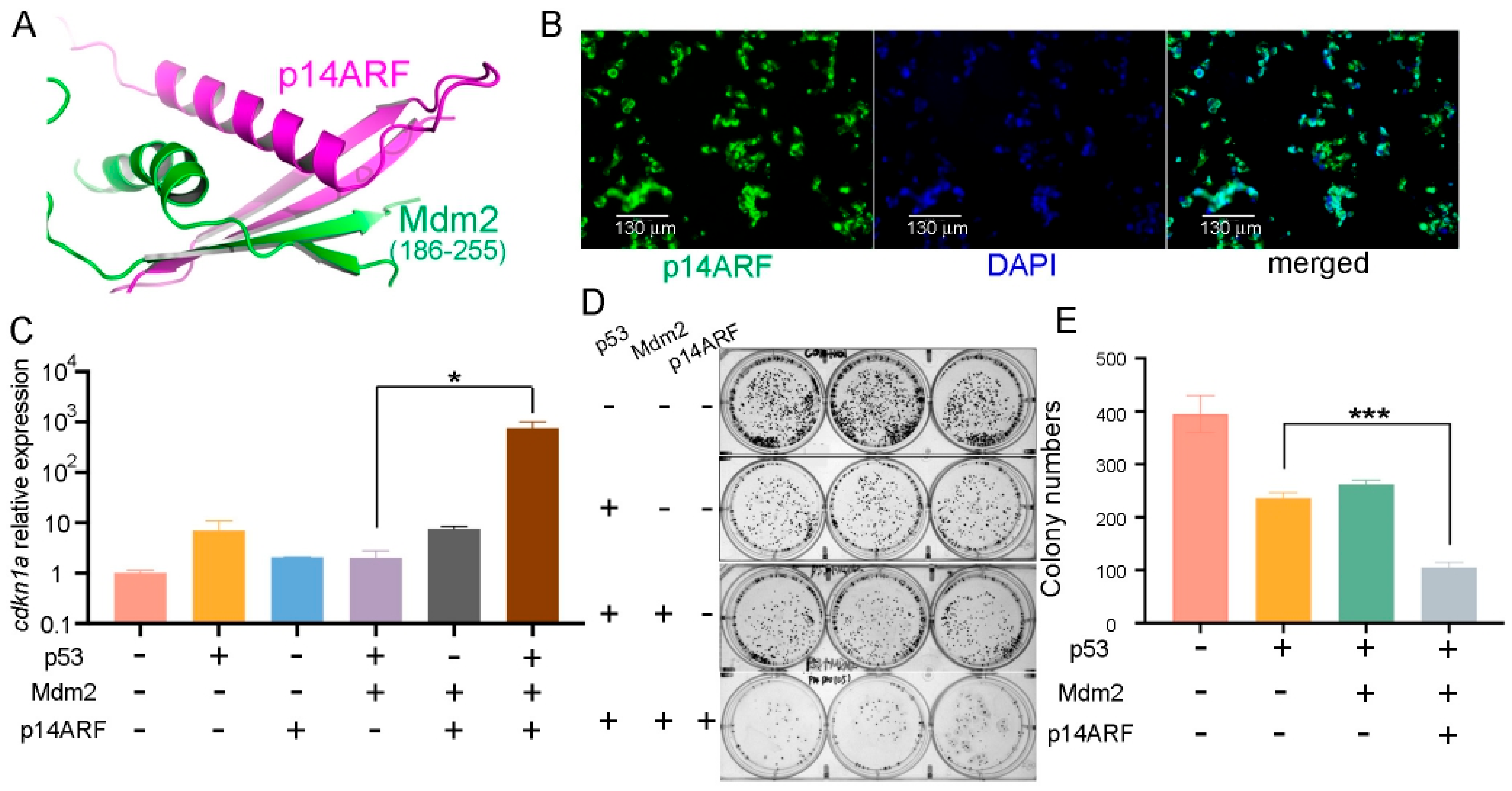 Figure 2. Delivery of purified p28-p14ARF protein strengthened the suppressive effects of the delivered p53 protein on CRC cell proliferation. (A) The N-terminal domain p14ARF (residues 1–63) folds into two β strands and an α helix and interacts with the middle part of human Mdm2 (residues 186–255), as predicted by Alphafold 3. (B) Purified GFP-tagged p28-p14ARF (residues 1–63, abbreviated as p28-p14ARF) protein was localized in the nuclei after delivery into HCT116 CRC cells. Scale bars: 130 μm. (C) Delivery of the p14ARF protein counteracted the inhibition of p53 by Mdm2 and drastically increased the expression of the p53 target gene cdkn1a. Purified p28-p53 and p28-p14ARF proteins were delivered while an Mdm2-encoding plasmid was transfected into HCT116 cells, and qRT-PCR analysis was subsequently performed. (D) Colony formation assays revealed that the purified p14ARF protein further increased the anti-proliferative effect of the purified p28-p53 protein on HCT116 cells. (E) Quantification of the colony formation assay results from (D). Statistical significance is denoted as follows: * p < 0.05, *** p < 0.001.