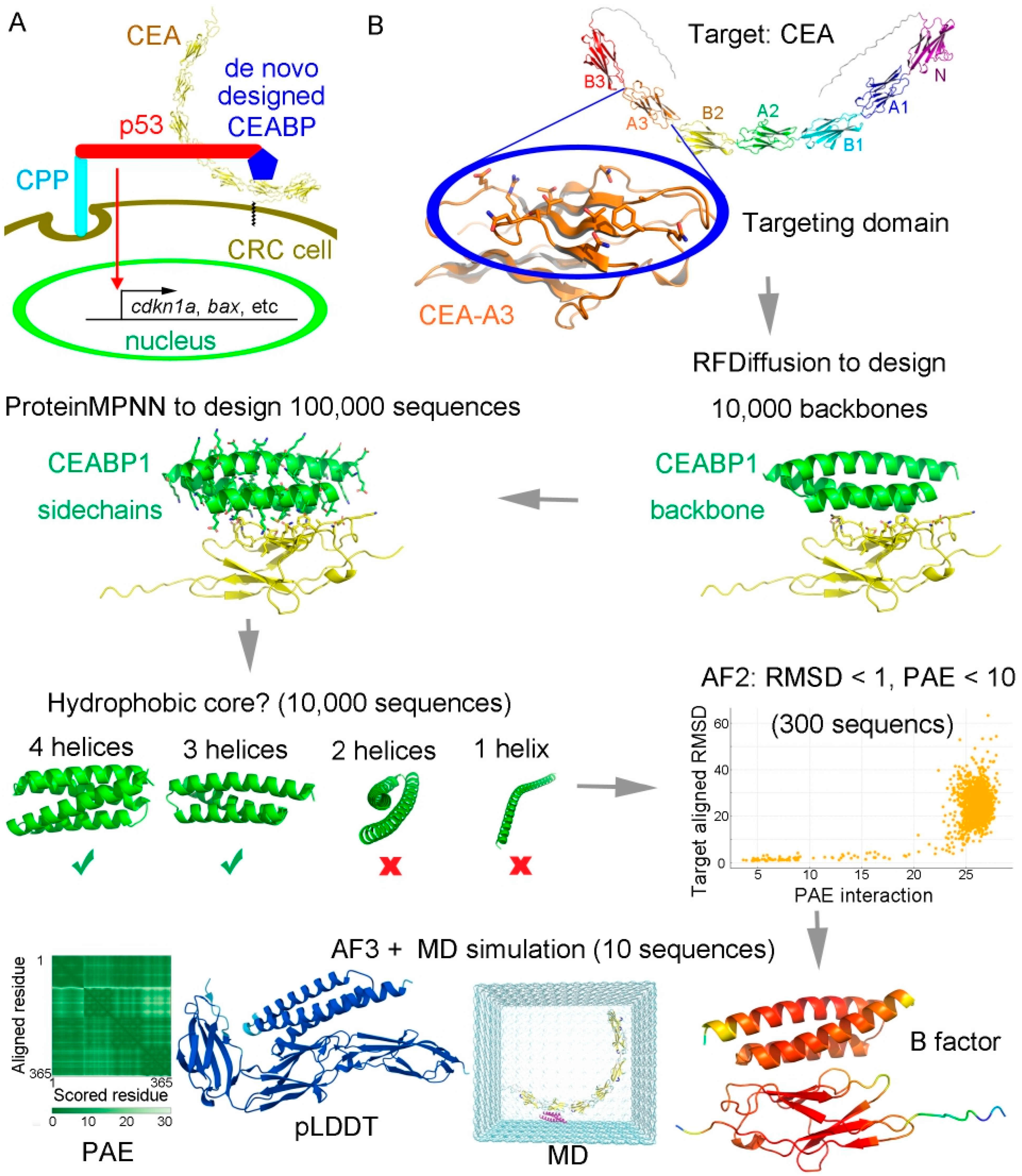 Figure 4. The strategy of using a de novo-designed CRC biomarker CEA binding protein to fuse with p28-p53 to facilitate specific targeted inhibition of CRC cells. (A) Scheme using a de novo-designed CEA binding protein CEABP to fuse with p53 tagged with the cell-penetrating peptide (CPP) p28, so as to specifically target CRC cells for inhibition. (B) The A3 or B2 domain of CEA was selected for specific targeting. The complete target CEA is shown at the top. The residues on one surface of CEA-A3 or CEA-B2 (highlighted in a blue oval) were chosen as “hotspots” for targeting binder design. RFDiffusion was employed to design the backbone scaffolds of binding proteins for CEA-A3 or CEA-B2, during which process 10,000 backbones were generated. ProteinMPNN was then employed to design the sequences, and 100,000 sequences were generated. Generated binders were filtered based on whether they contained hydrophobic cores. Designed proteins with four or three helices were selected, whereas those with two helices or only one helix were discarded. Alphafold2 was then employed to rapidly discard models that failed to recapitulate tight binding geometry. A molecular dynamics (MD) simulation for conformational sampling was performed, followed by Alphafold 3 rescoring to identify false positives that passed Alphafold 2 but were unstable during MD or had low predicted alignment error (PAE) or predicted local distance difference test (pLDDT) scores calculated by Alphafold3.