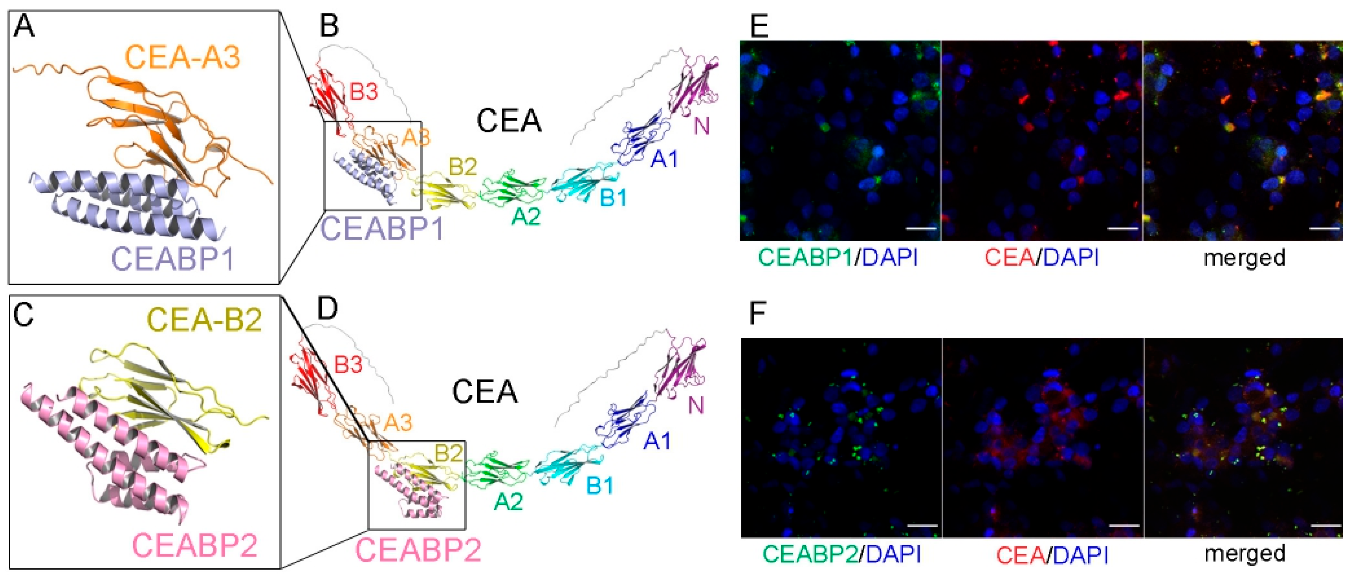 Figure 5. The de novo-designed CEABP1 and CEABP2, which specifically recognize the A3 and B2 domains of the CRC marker CEA, respectively. (A) The structure of CEABP1, the de novo-designed binding protein for CEA-A3, in complex with the extracellular A3 domain of CEA, as predicted by Alphafold 3. (B) The binding site of CEABP1 on the full-length CEA protein. (C) The structure of CEABP2, the de novo-designed binding protein for CEA-B2, in complex with the extracellular B2 domain of CEA, as predicted by Alphafold 3. (D) The binding site of CEABP2 on the full-length CEA protein. (E) CEABP1 colocalized with CEA on the cell membrane of the CEA-expressing CRC cell line LS174T. LS174T cells were incubated with purified GFP-tagged CEABP1 protein for 6 h before immunofluorescence staining. Scale bars, 20 μm. (F) CEABP2 colocalized with CEA on the cell membrane of LS174T cells.