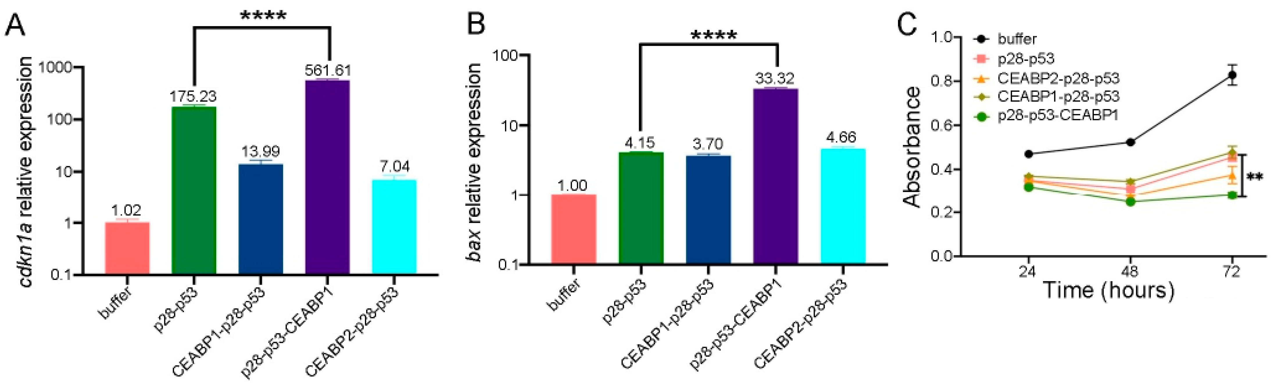 Figure 6. Specific targeting of CRC cells by fusing CEABP1 to the C-terminus of p28-p53 enhanced its ability to suppress CRC cell proliferation. (A) qRT-PCR analysis revealed that fusing CEABP1 to the C-terminus of p28-p53 was most effective at increasing the ability of the delivered p53 protein to promote cdkn1a transcription in LS174T cells. The relative cdkn1a expression levels are indicated above the columns. (B) The p28-p53-CEABP1 protein was most effective at increasing the transcription of bax when it was delivered into LS174T cells. The relative bax expression levels are indicated above the columns. (C) Compared with delivery of p28-p53, delivery of the purified p28-p53-CEABP1 protein more strongly inhibited the proliferation of LS174T cells, as shown by the CCK-8 assay. Statistical significance is denoted as follows: ** p < 0.01, **** p < 0.0001.
