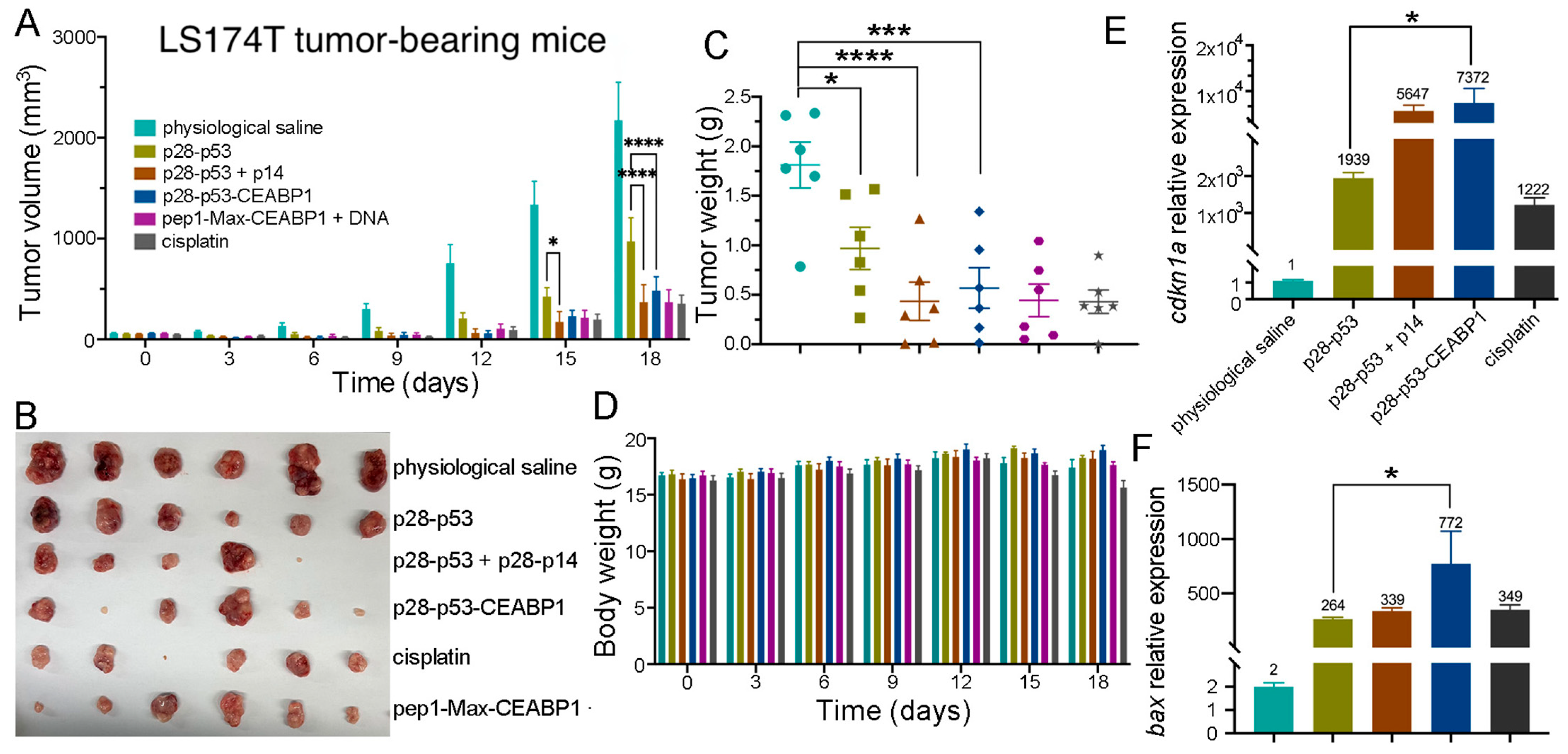 Figure 7. Specific targeting of CRC cells by fusing CEABP1 to the C-terminus of p28-p53 considerably increased its inhibition of xenograft tumor growth in mice. (A) Treatment with the purified p28-p53-CEABP1 protein inhibited LS174T cell subcutaneous xenograft tumor growth more effectively than p28-p53. The tumor growth curves of the following groups receiving different treatments are shown: physiological saline (n = 6), 5 mg of p28-p53 protein per kg of mice (n = 6), 5 mg of p28-p53 and p28-p14ARF each per kg of mice (n = 5), 5 mg of p28-p53-CEABP1 per kg of mice (n = 6), 8.28 mg of p28-p53-CEABP1 and TCF/LEF TFD DNA (molar ratio 3:1) per kg of mice (n = 6), and 5 mg cisplatin per kg of mice (n = 6). Administration started when the tumors grew to 100 mm3. (B) Representative images of LS174T cell xenograft tumors at the experimental endpoint (day 18). (C) LS174T tumor weights at the endpoint. The color scheme for the different groups is the same as that in (A). (D) Treatment with p28-p53-CEABP1 did not cause perceptible changes in mouse body weight during the experiment. The color scheme for the different groups is the same as that described in (A). (E) qRT-PCR analysis revealed that, compared with the absence of CEABP1, the injection of purified p28-p53-CEABP1 substantially increased the cdkn1a transcript level in the tumor tissue. (F) qRT-PCR analysis revealed that p28-p53-CEABP1 drastically increased bax mRNA expression compared with p28-p53 in tumors. The color scheme for the different groups is the same as that in (E). Statistical significance is denoted as follows: * p < 0.05, *** p < 0.001, **** p < 0.0001.