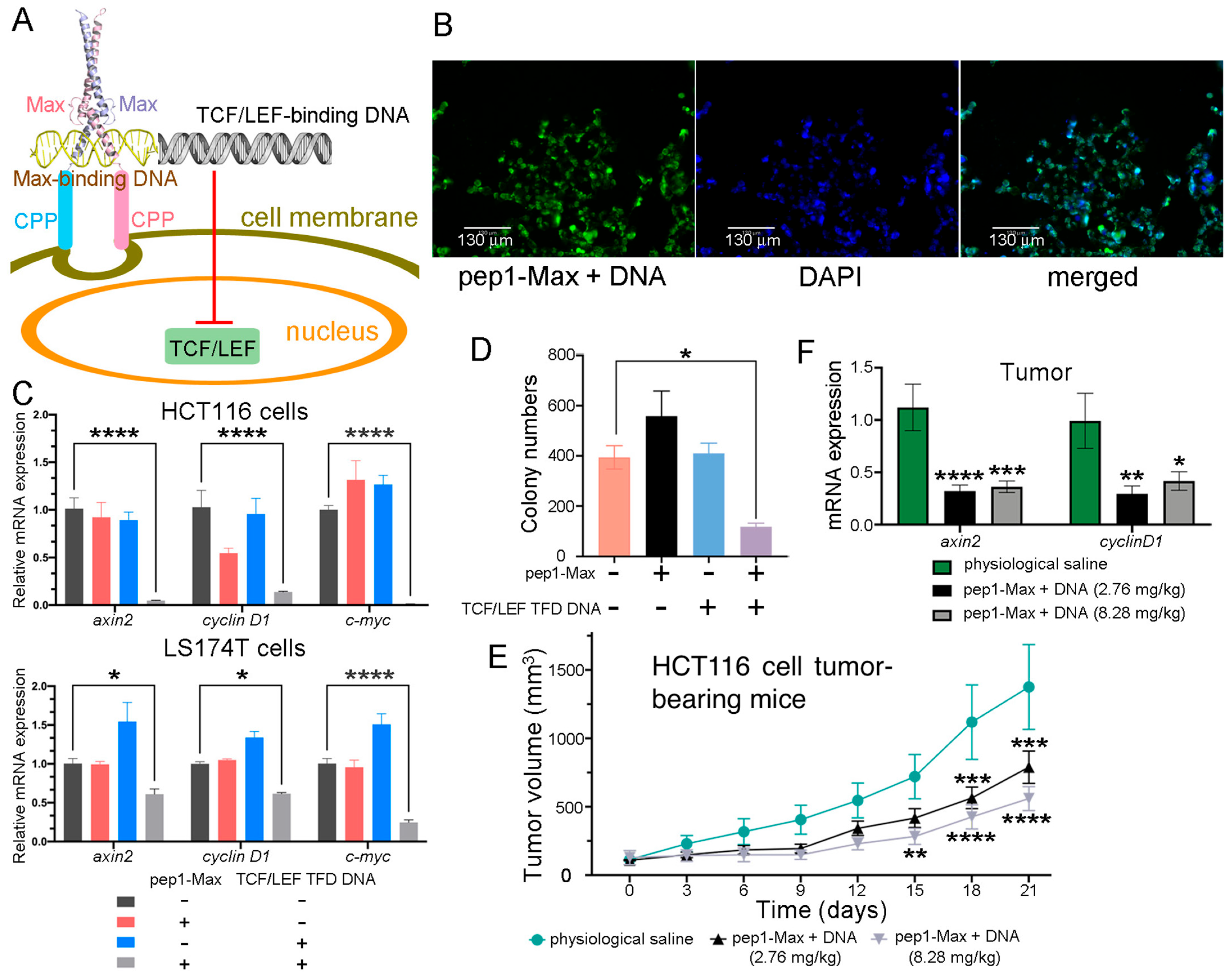 Figure 8. Delivery of TCF/LEF TFD DNA into CRC cells inhibited CRC cell proliferation and xenograft tumor growth. (A) The delivery scheme of TCF/LEF TFD DNA. The TCF/LEF-binding DNA was linked with the Max-binding DNA to function as TCF/LEF TFD DNA. The human Max DNA-binding domain was fused with the cell-penetrating peptide pep1, and the fusion protein was employed to deliver the TCF/LEF TFD DNA into CRC cells, which competitively inhibited endogenous TCF/LEF from binding to its target gene promoters and prevented the transcription of Wnt signaling-responsive genes. (B) TCF/LEF TFD DNA could be efficiently delivered into LS174T CRC cells and was located in the nuclei. Fluorescence microscopy images of LS174T cells delivered with FAM-labeled TCF/LEF TFD DNA and purified pep1-Max protein are shown. Scale bars: 130 μm. (C) Delivery of TCF/LEF TFD DNA suppressed the expression of the Wnt signaling target genes axin2, cyclin D1, and c-myc. TCF/LEF TFD DNA and/or purified pep1-Max protein were delivered into HCT116 or LS174T CRC cells, and qRT-PCR analysis was performed to assess the relative expression levels of axin2, cyclin D1, and c-myc mRNA transcripts. (D) Delivery of TCF/LEF TFD DNA by purified pep1-Max protein suppressed HCT116 cell proliferation in the colony formation assay. A quantification of the colony formation assay results is shown. (E) Treatment of HCT116 cell xenograft mice via tail vein injection of TCF/LEF TFD DNA and purified pep1-Max protein decelerated tumor growth. Tumor growth curves of HCT116 cell subcutaneous xenograft mice treated with physiological saline (n = 6), 2.76 mg of pep1-Max and TCF TFD DNA (molar ratio 3:1) per kg of mice (n = 8), or 8.28 mg of pep1-Max and TCF TFD DNA (molar ratio 3:1) per kg of mice (n = 7) are shown. Administration started when the tumors grew to 100 mm3 in volume. (F) Treating mice with TCF/LEF TFD DNA and pep1-Max protein decreased axin2 and cyclin D1 mRNA expression in tumors, as revealed by qRT-PCR analysis of tumor samples. Statistical significance is denoted as follows: * p < 0.05, ** p < 0.01, *** p < 0.001, **** p < 0.0001.