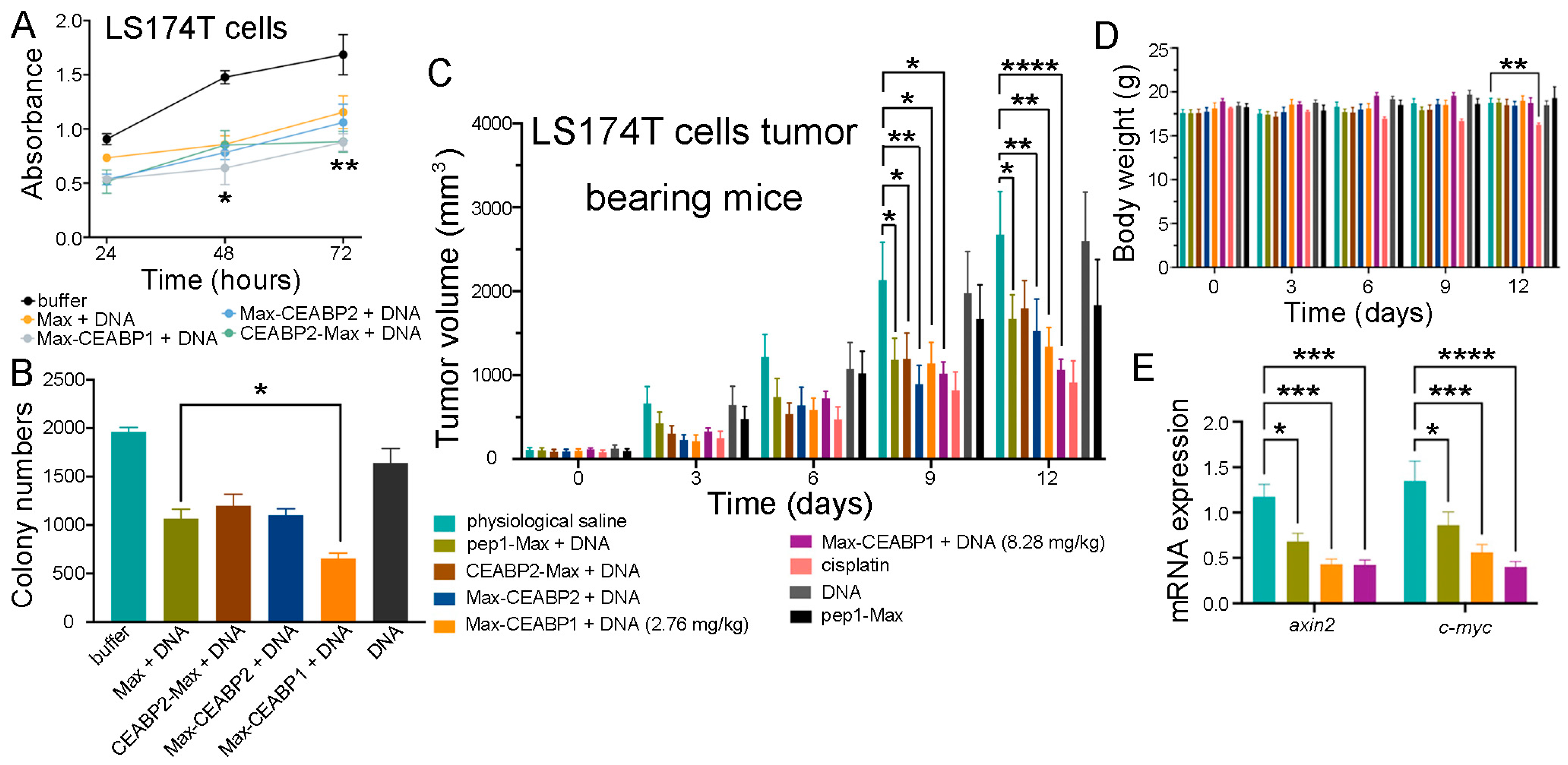 Figure 9. Targeting CEA-expressing CRC cells with a designed CEA-binding protein enhanced the antitumor effect of TCF/LEF TFD DNA. (A) Fusion of CEABP1 to the C-terminus of pep1-Max enhanced the suppression of LS174T cell proliferation by the delivered TCF/LEF TFD DNA, which was examined via a CCK-8 assay. The statistics in the figure are for comparison between the pep1-Max-CEABP1 protein plus TCF/LEF TFD DNA group and the pep1-Max protein plus the same DNA group. (B) Colony formation assays verified that fusing CEABP1 to pep1-Max caused the delivery of TCF/LEF TFD DNA to inhibit LS174T cell growth more strongly than in the absence of CEABP1. (C) Targeting LS174T cell subcutaneous xenograft tumors with CEABP1 enhanced the ability of TCF/LEF TFD DNA to decelerate tumor growth in mice. The tumor growth curves of the following groups receiving different treatments are shown: physiological saline (n = 6), 2.76 mg of pep1-Max protein and TCF/LEF TFD DNA per kg of mice (n = 6), 2.76 mg of CEABP2-pep1-Max protein and TCF/LEF TFD DNA per kg of mice (n = 6), 2.76 mg of pep1-Max-CEABP2 protein and TCF/LEF TFD DNA per kg of mice (n = 6), 2.76 mg of pep1-Max-CEABP1 protein and TCF/LEF TFD DNA per kg of mice (n = 6), 8.28 mg of pep1-Max-CEABP2 protein and TCF/LEF TFD DNA per kg of mice (n = 6), 5 mg cisplatin per kg of mice (n = 6), 7.34 mg of pep1-Max protein per kg of mice (n = 6), and 0.94 mg of TCF/LEF TFD DNA per kg of mice (n = 5). For the above protein and DNA mixtures, the protein-to-DNA molar ratio was 3:1. Administration started when the tumors grew to 100 mm3 in volume. (D) Fusing CEABP1 or CEABP2 to pep1-Max did not cause any body weight change in the mice during the experiment. (E) Specific targeting of CEA-expressing LS174T cells with CEABP1 further decreased the mRNA expression of Wnt-responsive genes in tumors. qRT-PCR analysis of axin2 and c-myc mRNA transcript levels in tumor samples from the indicated groups was performed. Statistical significance is denoted as follows: * p < 0.05, ** p < 0.01, *** p < 0.001, **** p < 0.0001.