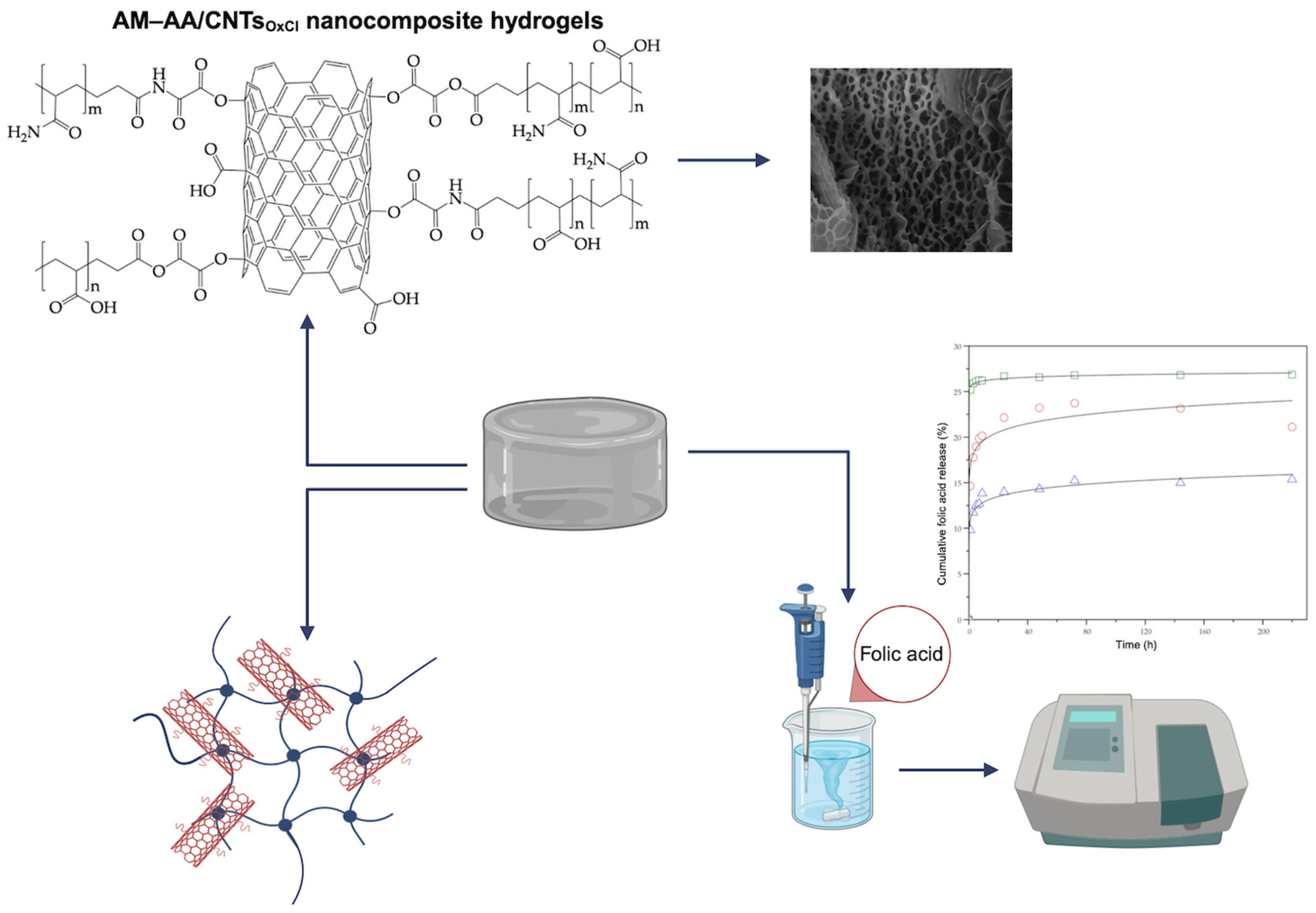 In this study, AM–AA hydrogels and AM–AA/CNTsOxCl nanocomposite hydrogels were synthesized and characterized, and their capacity to release FA was evaluated. CNTs were synthesized via chemical vapor deposition (CVD), purified with overheated steam, partially oxidized through acid treatment, and chemically functionalized with oxalyl chloride (OxCl) to insert acyl chloride functionalities on their walls. Functionalized CNTs (CNTsOxCl) were used to prepare nanocomposite hydrogels, and the AM–AA and AM–AA/CNTsOxCl nanocomposite hydrogels were prepared via redox polymerization. The morphologies of the purified CNTs, partially oxidized CNTs, and functionalized CNTs were examined using transmission electron microscopy (TEM). Raman spectroscopy was used to study the vibrational behaviors of the partially oxidized and functionalized CNTs, as well as the AM–AA hydrogels and AM–AA/CNTsOxCl nanocomposite hydrogels. Swelling data were fitted using a second-order kinetic model. All hydrogels were further analyzed by X-ray photoelectron spectroscopy (XPS), differential scanning calorimetry (DSC), and field-emission scanning electron microscopy (FE–SEM), and their mechanical properties were evaluated using compression tests. FA release from the prepared hydrogels was examined using various kinetic models.