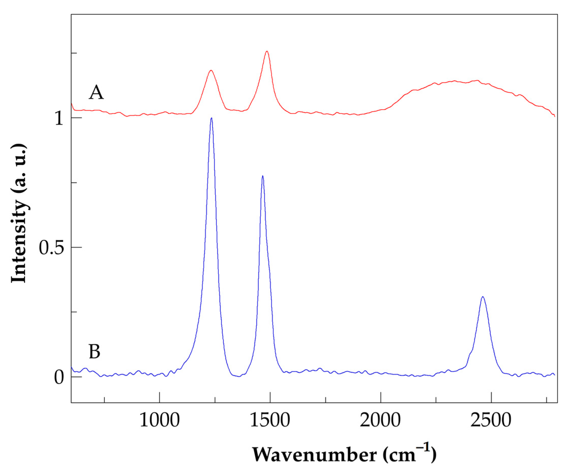 Figure 2 shows the Raman spectra of CNTspoxi (Figure 2A) and CNTsOxCl (Figure 2B), revealing three bands in both spectra. Table 1 lists the wavenumbers of the D, G, and G’ bands, the area of the G-band, and the ID/IG ratio determined from the scattering intensities of the D- and G-bands. At low frequencies, a disorder-induced band (D-band) is detected (at 1233 cm−1 in CNTspoxi and 1235 cm−1 in CNTsOxCl). A D-band is produced when a double-resonance process occurs, owing to elastic and inelastic scattering caused by defects and phonons, respectively [30]. In the Raman spectra of SWCNTs bundles, the D-band is observed between 1250 and 1450 cm−1 and depends on the mean nanotube diameter [31]. In MWCNTs, the D-band shifts to lower frequencies [32]. This finding confirms the presence of MWCNTs in the CNTspoxi and CNTsOxCl samples, consistent with the micrographs of CNTspoxi shown in Figure 1. The bands at 1485 cm−1 (CNTspoxi) and 1466 cm−1 (CNTsOxCl) are attributed to the graphite band (G-band), caused by a first-order Raman effect. The G-band of different carbonaceous materials is typically detected in the region of 1450–1750 cm−1 [33]. In CNTs, the G-band involves an optical phonon mode between two carbon atoms in one graphene unit cell, which constitutes the basic structure of a graphene sheet. This band is caused by high ordered carbon structures like those that form the walls of the CNTs. The shift in the G-band to lower frequencies in CNTsOxCl suggests a modification of the vibrational response of CNTsOxCl, caused by the presence of guest molecules with different electronic characteristics. According to the chemical functionalization route used in this study, this change can be attributed to the presence of acyl chloride groups on the CNTsOxCl walls. At higher frequencies, a G’-band is detected at 2436 cm−1 for CNTspoxi and 2461 cm−1 for CNTsOxCl. For carbonaceous materials, the G’-band is observed as a broad peak in the 2400–2800 cm−1 region [33], arising from a double-resonance process. G’-band is an overtone of the D-band and is observed in the spectrum of materials with sp2 bonded carbon atoms. Similarly to the D-band, the G’-band is sensitive to the chirality and diameter of CNTs. The clear differences in intensity and broadness of the G’-band detected in the spectra of CNTspoxi and CNTsOxCl are caused by the different structural arrangements of both CNT types. The ID/IG ratio is higher for CNTsOxCl than for CNTspoxi, indicating a decrease in the order and crystallinity after functionalization. Fantini et al. attributed such increases in disorder to the formation of structural defects caused by the attachment of chemical groups to the CNTs walls [34]. This supports the conclusion that the presence of acyl chloride groups in the CNTsOxCl walls increases the disorder of the walls. Our previous study involving Fourier transform infrared spectroscopy (FT–IR) confirmed the insertion of acyl chloride groups onto partially oxidized CNTs following a similar chemical route to that used in this work [35].