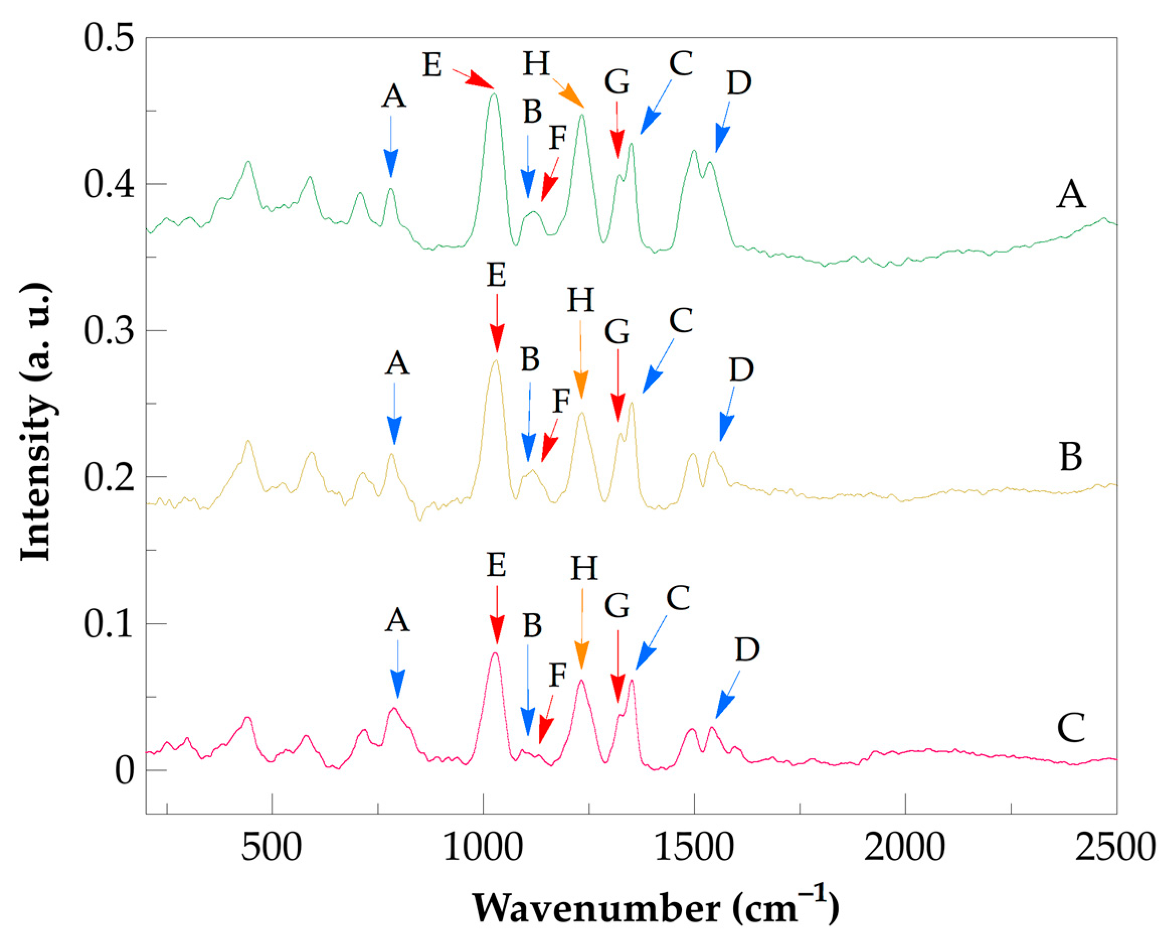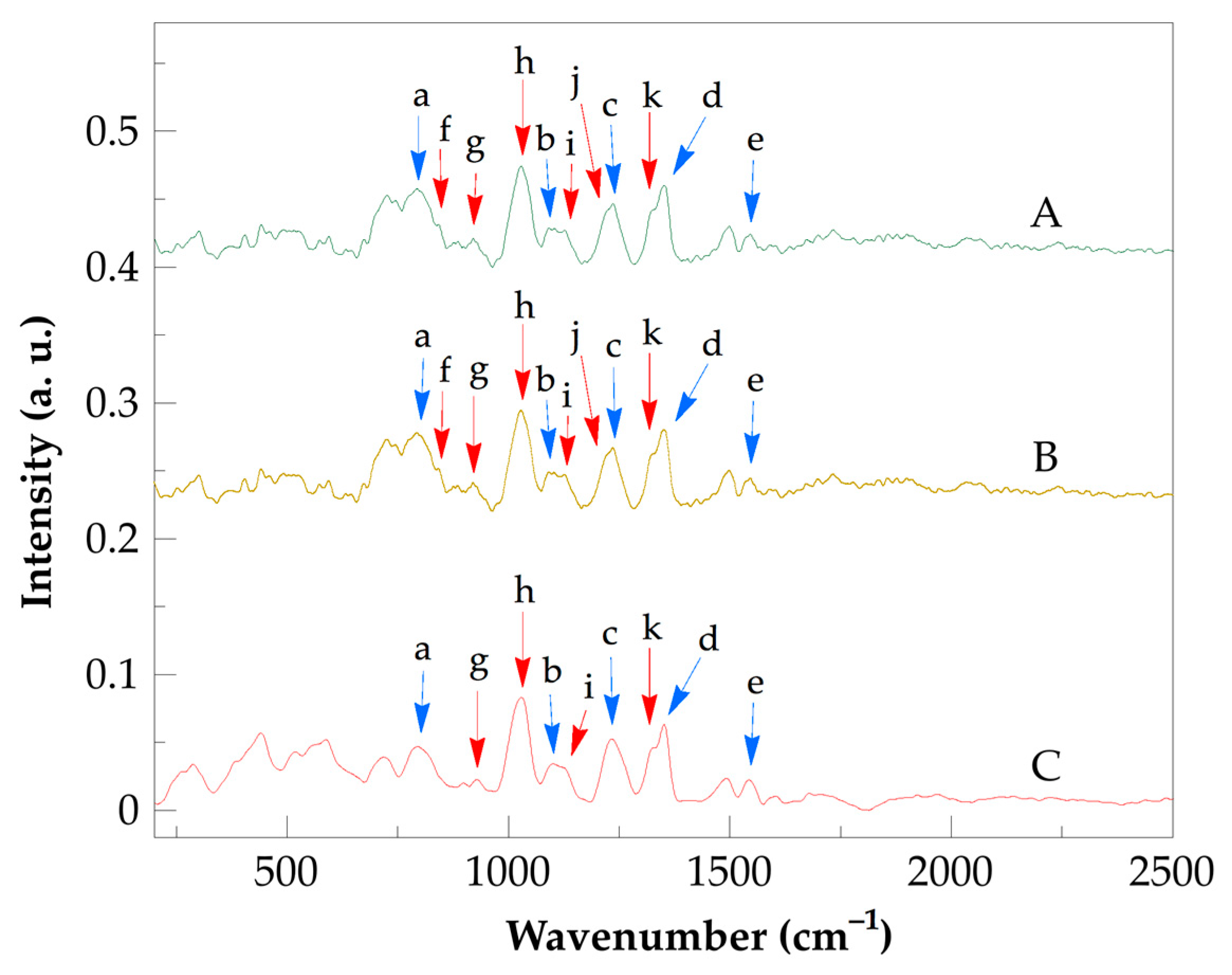 Figure 3 shows the Raman spectra of dry samples of hydrogels Hydro 1 (Figure 3A), Hydro 2 (Figure 3B), and Hydro 3 (Figure 3C) in the region of 200–2500 cm−1. The vibrational band assignments for the polyacrylamide chains (blue arrows) were based on a previous report [36]. In the spectrum of Hydro 3, characteristic peaks are observed at 796 cm−1 (CH2 rocking vibration), 1101 cm−1 (C–C skeletal stretching), 1233 cm−1 (NH2 wagging), 1352 cm−1 (CH2 wagging), and 1544 cm−1 (amide I, C=O stretching) [37]. Similar spectral contributions are detected in Hydro 2 and Hydro 1 at nearly the same frequencies. For poly(acrylic acid) chains (red arrows), most contributions appear as shoulders adjacent to the polyacrylamide chain bands, except for two peaks. In the spectrum of Hydro 1, a weak band at 921 cm−1 is assigned to the stretching vibrations of the carboxylic acid dimer, and an intense band at 1029 cm−1 is attributed to CH2 rocking [38]. Other peaks assigned to the vibrations of the poly(acrylic acid) chains are detected at 843, 1127, 1224, and 1326 cm−1, attributed to C–COOH stretching [38], C-CH2 stretching, C–O stretching coupled with O–H in-plane bending, and –CCO stretching [39], respectively. Hydro 2 shows a very similar spectral pattern. Conversely, Hydro 3 exhibits a shift in the carboxylic acid dimer band to 930 cm−1 and the disappearance of the weak shoulders attributed to C–COOH stretching and C–O/O–H coupled vibrations in plane bending. These changes may be due to the higher poly(acrylic acid) chain content of Hydro 3, which modifies the vibrational frequencies of some sensitive groups. Additionally, other peaks (not marked with arrows) at wavenumbers between 250 and 750 cm−1 were detected (more clearly in the spectrum 3C). Thus, from low to high wavenumbers, peaks detected at 288, 441, 558, and 718 cm−1 were assigned to C–C bending of aliphatic chain, C–C=O bending, –COOH skeletal vibration, and O–C–O bending of carboxilate functionality, respectively. The coexistence of Raman bands due to the vibrations of the polyacrylamide and poly(acrylic acid) chains confirms the successful synthesis of the AM–AA hydrogels. Table 2 lists the most significant bands described and marked with a blue or red arrow.