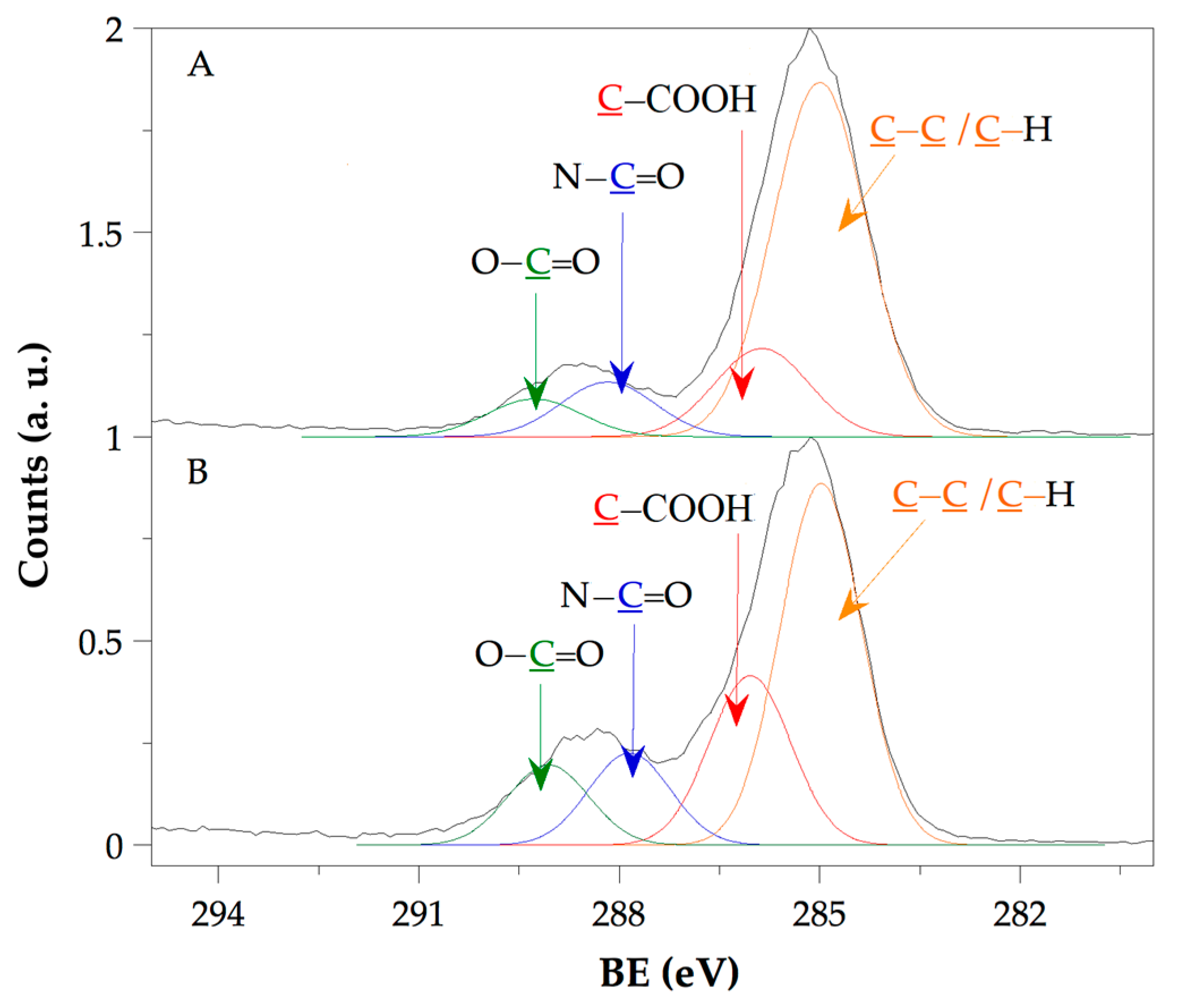 Figure 5 shows the C1s core level normalized spectra of Nano Hydro 2 (Figure 5A) and Hydro 2 (Figure 5B), peak-fitted using the active background method included in AAnalyzer v 1.42 software [41]. The components and their atomic concentrations of Hydro 2 involve CC/C–H bonds at 285.0 eV [42] (39.5%), CH–COOH bonds at 285.8 eV [43] (19.3%), –N–C=O bonds at 287.9 eV [44,45] (9.6%), and –O–C=O bonds at 289.0 eV [42] (7.7%). Furthermore, the components of Nano Hydro 2 and their atomic concentrations include CC/C–H bonds at 285.0 eV [42] (39.4%), CH–COOH bonds at 285.9 eV [43] (9.2%), –N–C=O bonds at 288.1 eV [45] (6.1%), and –O–C=O bonds at 289.3 eV [42] (3.4%). The reduced molar concentrations and slight shifts to higher binding energies of the CH–COOH, –O–C=O, and –N–C=O bonds in Nano Hydro 2 compared with Hydro 2 suggest that chemical reactions occur, in which these chemical functionalities participate. Similar spectral behaviors have been reported previously [46,47]. Acyl chloride groups react with nucleophiles bonded to hydrogen atoms during addition-elimination reactions. Thus, based on the obtained results, we consider that the acyl chloride groups inserted on the CNTsOxCl walls react with the nitrogen atom of the amine bonds that form part of the primary amide functionality inserted on the acrylamide monomer, producing secondary amide groups and grafting these monomeric molecules onto CNTsOxCl. Because the acyl chloride functionality also reacts with water (the solvent used to prepare the hydrogels and nanocomposite hydrogels) to produce carboxyl groups, the reaction should be carried out at the beginning of the nanocomposite hydrogel synthesis. In parallel, the hydroxyl groups inserted on the CNTsOxCl walls can react with the carboxyl groups that form part of either the acrylic acid monomer or poly(acrylic acid) chains to produce ester groups. Through this chemical path, monomeric acrylic acid units or poly(acrylic acid) oligomers (more available at the beginning of the nanocomposite hydrogel synthesis) are grafted onto the CNTsOxCl walls. Scheme 1 presents the chemical reaction described showing the polymeric chains formed by AM and AA units grafted onto functionalized CNTsOxCl. The left-hand side of this chemical reaction shows CNTsOxCl decorated with AA and AM monomeric units. The right-hand side shows the final structure, which was embedded within the gel network. Notably, owing to the synthesis of AM–AA hydrogels and AM–AA/CNTsOxCl nanocomposite hydrogels via radical polymerization, the grafted chains on CNTsOxCl contain randomly ordered AA and AM units.