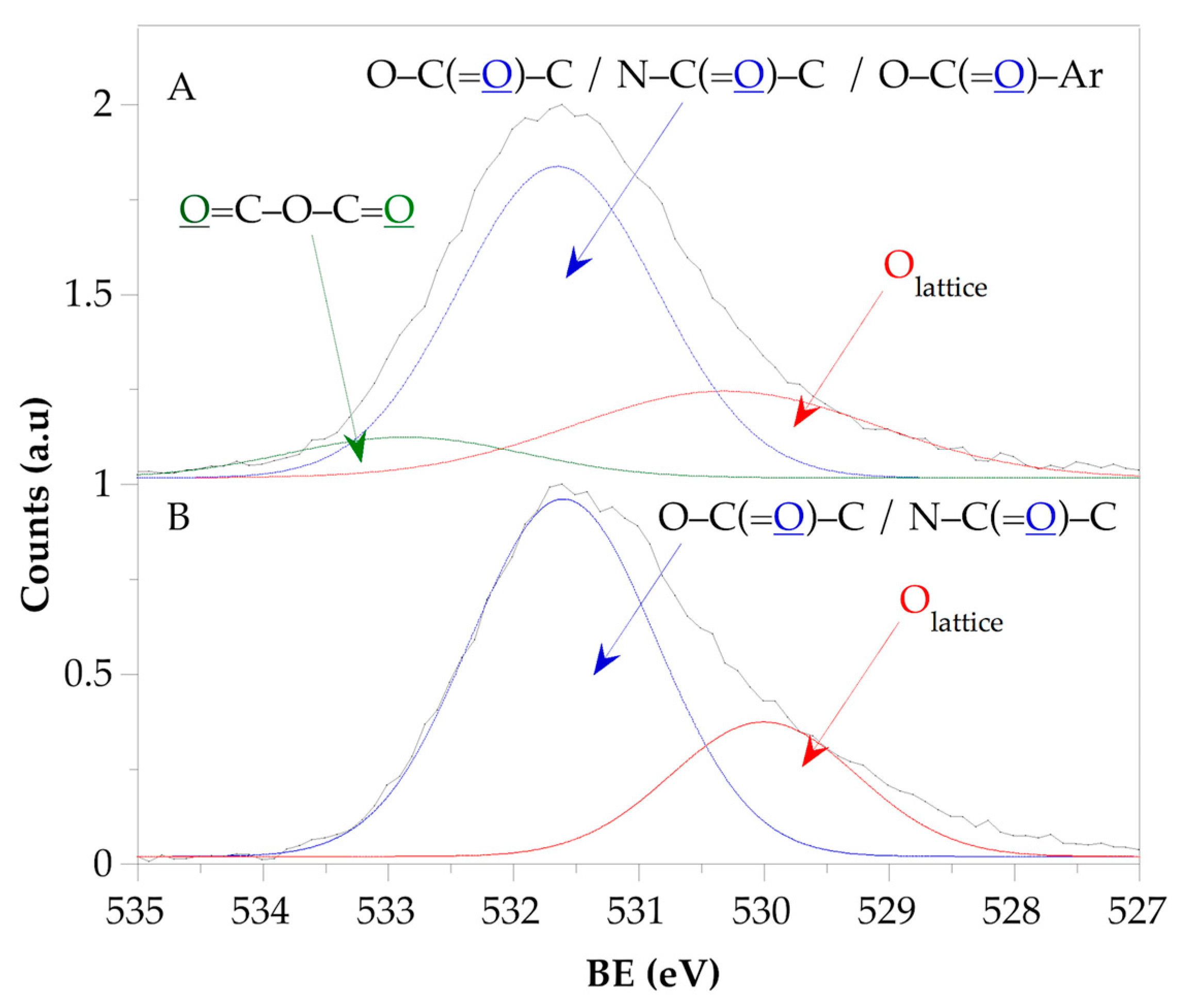 Figure 6 shows the O1s core-level normalized spectra of Nano Hydro 2 (Figure 6A) and Hydro 2 (Figure 6B), with the components of the O1s spectrum of Hydro 2 being observed at two positions. The components and their atomic concentrations are Clattice at 530.6 eV [48] (3.5%) and O–C(=O)–C [49]/N–C(=O)–C [43] at 531.5 eV (4.5%). Conversely, the components of the O1s spectrum of Nano Hydro 2 are detected at three positions: Clattice at 530.3 eV [48] (5.8%), O–C(=O)–C [49]/N–C(=O)–C [43]/O–C(=O)–Ar [49] at 531.7 eV (13.6%), and O=C–O–C–O [49] at 532.8 eV (2.1%). Lattice oxygen atoms represent oxygen atoms within a bulk structure. In redox reactions, such as those used in this study for hydrogel and nanocomposite hydrogel synthesis, the lattice atoms can participate in electron transfer reactions [50]. Oxygen contamination of polyacrylamide gels during gel preparation has also been reported [51]. The higher atomic concentration of Olattice in Nano Hydro 2 compared with Hydro 2 indicates lattice oxygen contributions from CNTsOxCl. Furthermore, the increased atomic concentration of the bonds detected at 531.7 eV in the spectrum of Nano Hydro 2 than those detected at 531.5 eV in the spectrum of Hydro 2 is due to the contributions of the O–C(=O)–Ar functionality. This confirms the incorporation of CNTsOxCl in Nano Hydro 2 and reflects the aromatic nature of CNTs, as previously reported [52]. Furthermore, the detection of the anhydride functionality at 532.8 eV in Nano Hydro 2 confirms that functionalized CNTs are embedded in the developed nanocomposite hydrogels, as shown in Scheme 1.