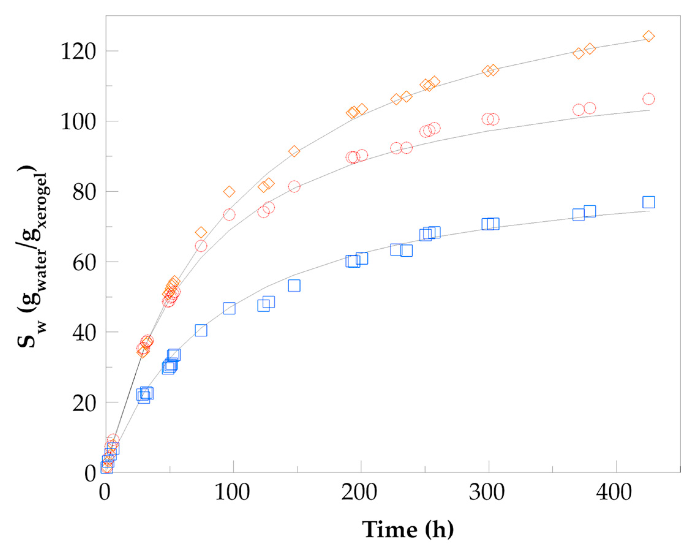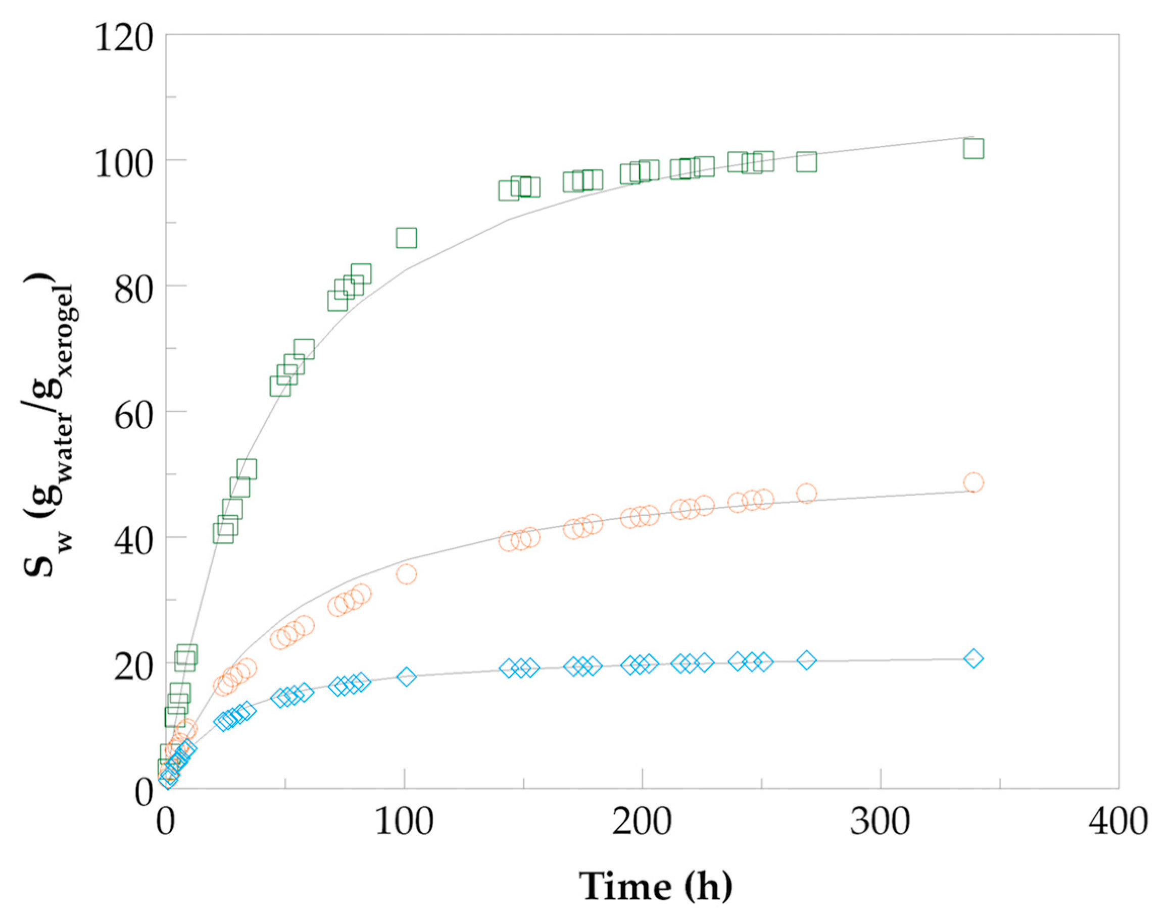 Figure 7. Swelling isotherms of the hydrogels Hydro 1 (Ijms 26 09847 i001), Hydro 2 (Ijms 26 09847 i002), and Hydro 3 (Ijms 26 09847 i003).