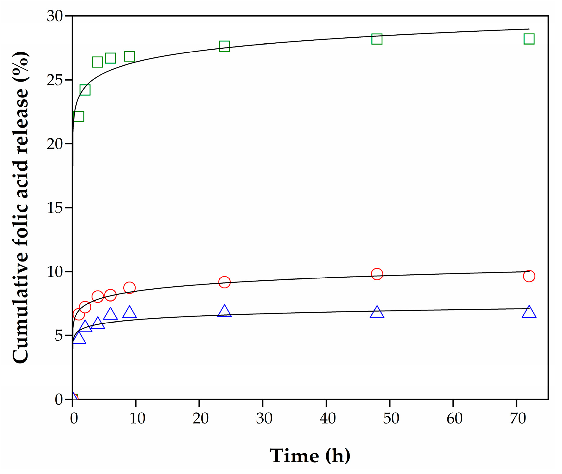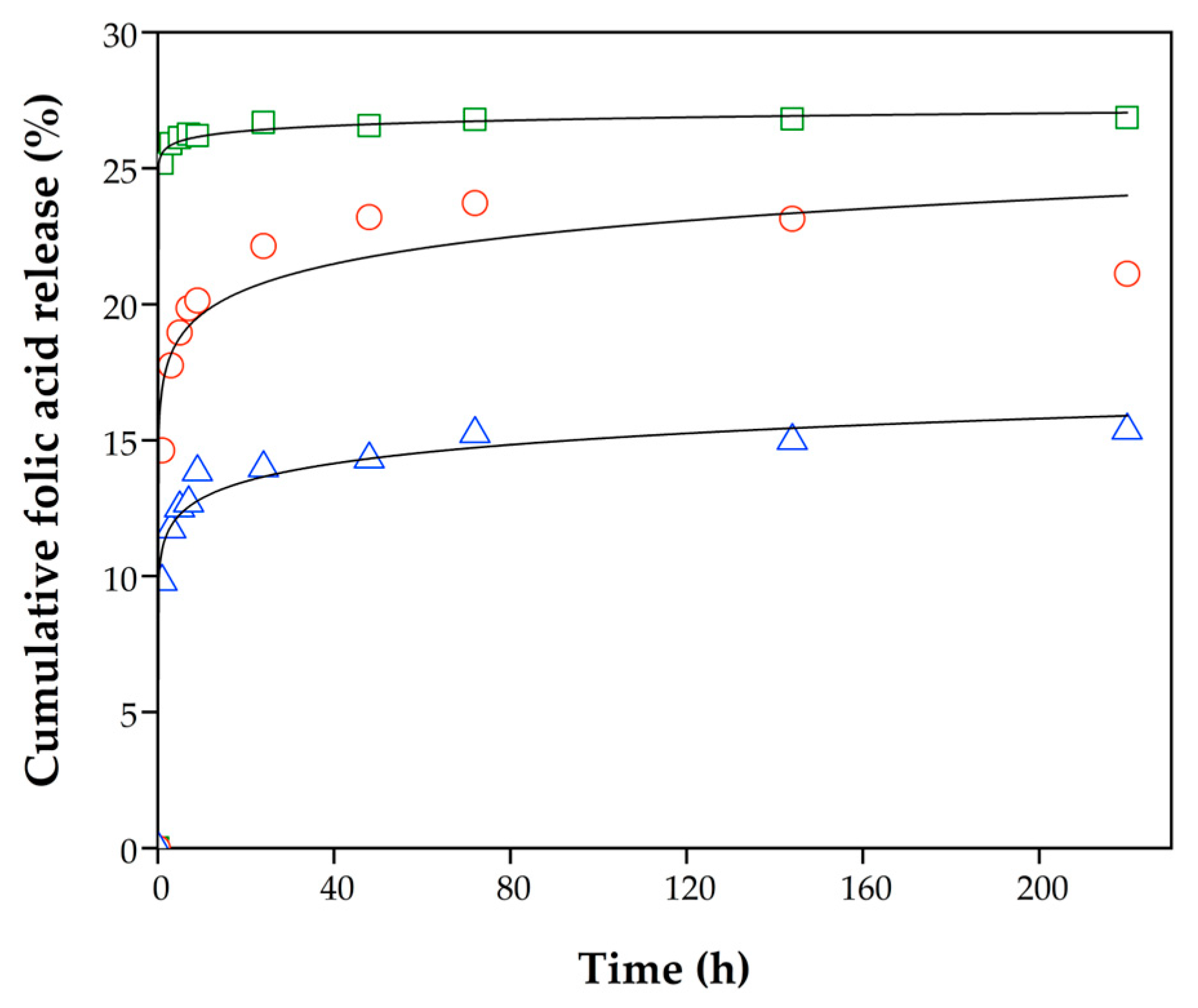 Figure 12. Folic acid release for Nano Hydro 1 (Ijms 26 09847 i007), Nano Hydro 2 (Ijms 26 09847 i002), and Nano Hydro 3 (Ijms 26 09847 i006).