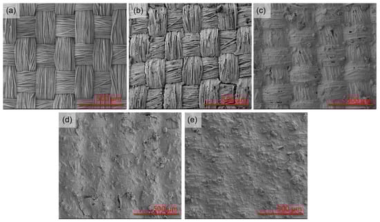 SEM images of silk fabric (a), and silk fabric functionalized with HiPCO of different concentrations: 0.01%wt. (b), 0.03%wt. (c), 0.05%wt. (d), and 0.06%wt. (e).