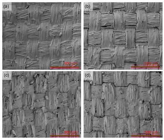 Figure 2 shows selected concentrations of HiPCO-functionalized fabric, further covered with SF before and after crystallization. The fabric with various concentrations of HiPCO was covered with the same amount of SF (4.8 g/m2). Figure 2a,c reveal HiPCO-functionalized fabric covered with SF, which does not differ significantly after the crystallization process (Figure 2b,d). The samples after the crystallization process may show slight cracks, which also prove that SF was crystallized and took a dominant β-sheet form. The β-sheets formed during crystallization are stacked to form tightly packed β-crystallites, folding into an ordered, repeating structure of antiparallel β-sheets. The folding process can cause the formation of some cracks within the layer. Further research in this study revealed that they do not significantly influence the protective properties of SF coverage and still support HiPCO on the fabric.