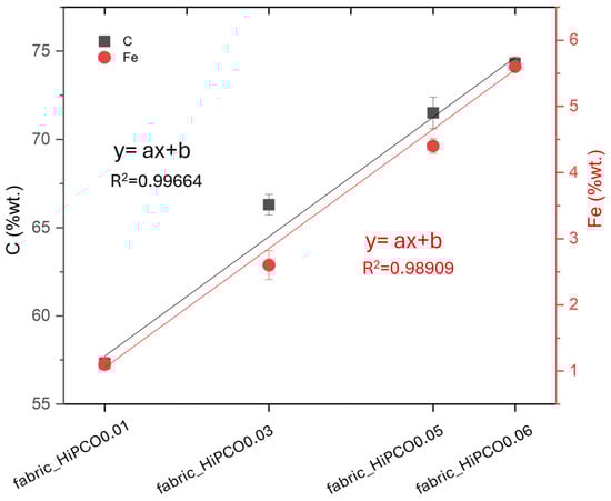 EDS analysis reveals the main elements related to silk fabric and HiPCO (Table 2). The elements characteristic of silk fibroin amino acids, such as carbon, nitrogen, and oxygen, are present in all samples. Moreover, all samples contain trace amounts of sodium and sulfur. Sodium remains in silk fabric due to the application of sodium carbonate for the degumming process in the first stages of fabric production []. Silk fabric consists of silk fibroin protein composed of heavy (H, ~390 kDa) and light (L, ~26 kDa) chains linked together via a single disulfide bond []. The presence of sulfur in the fabric indicates natural silk. However, sodium was also present in the surfactant used for HiPCO dispersion (bile salt–cholic acid–deoxycholic acid–sodium salt mixture); its amount does not increase with the increase in HiPCO content. It demonstrates the effectiveness of water rinsing, after HiPCO deposition, in removing the surfactant from the samples. Moreover, for samples functionalized with HiPCO, another element, iron, is present due to the presence of the metal catalyst in the nanotube synthesis process. The concentration of iron and carbon, which are the main nanotube elements, increases with increasing HiPCO concentration on the fabric (Figure 3).