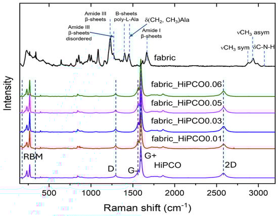 The Raman spectrum of HiPCO presents characteristic bands for these CWNTs [,], which are present for all silk fabric samples functionalized with HiPCO (Figure 4). In the low frequency range of 100 to 300 cm−1 there are radial breathing mode (RBM) bands characteristic of SWNTs and related to radial vibrations of nanotubes. Two dominant bands at 1596 and 1564 cm−1 are correlated with G+ and G-, responsible for vibrations along and perpendicular to the tube axis. A low-intensity D (disorder) band at 1293 cm−1 indicates a small number of defects. The band at 2582 cm−1 is called 2D and is related to D-band overtone. Typical Raman bands for silk fabric are clearly visible only for pure fabric, because the signal intensity of SWNTs excites silk fibroin from the fabric. Raman bands characteristic of silk fabric are present at the same number and position for silk fabric after functionalization with HiPCO, but their intensity is significantly lower. Typical silk fibroin amide bands are noted, amide I at 1664 cm−1, indicating a β-sheet stable structure of the protein. Amide III bands at 1230 cm−1 also revealed a β-sheet ordered structure of fibroin with a small contribution of β-sheet disordered with a band at 1264 cm−1 []. The two bands at 1402 and 1452 cm−1 are related to vibrations of one of the most important silk fibroin amino acids, alanine (Ala). The band at 1402 cm−1 originates from β-sheet parts of poly-L-alanine [] and 1452 cm−1 corresponds to CH2 and CH3 bending in alanine [].