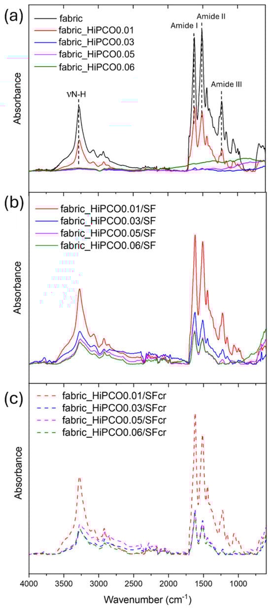 Infrared spectra of silk fabric and silk fabric functionalized with HiPCO of different concentrations (a), functionalized silk fabrics with HiPCO and coated with silk fibroin (b), functionalized silk fabrics with HiPCO, coated with silk fibroin and after crystallization process of SF (c).