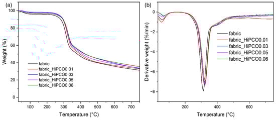 TG (a) and DTG (b) thermograms of silk fabric and silk fabric functionalized with HiPCO of different concentrations.