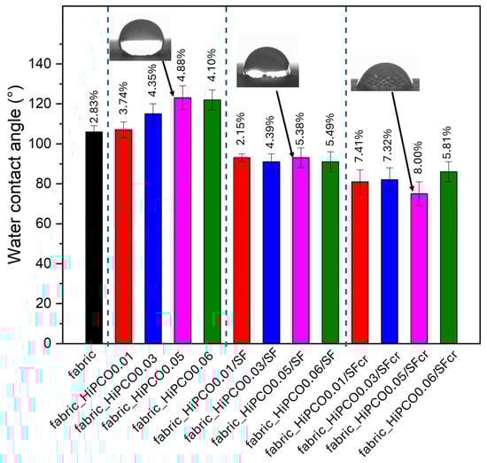 Water contact angle of silk fabric and silk fabric functionalized with HiPCO of different concentrations, further coated with silk fibroin, and crystallized. CV (coefficient of variation) values were provided for each group of analyzed samples. Insets: The examples of water drops on the fabric after the subsequent stages of the functionalization process.