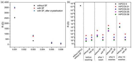 Figure 8a presents the resistance value depending on HiPCO content on the fabric. Resistance decreases with increasing HiPCO content from about 2.5 × 103 Ω for 0.01%wt. to 50 Ω for 0.06%wt. of HiPCO. This means that the higher the SWNT deposition, the higher the electrical conductivity of the fabric. It was reported that HiPCO incorporated through the dying approach allowed the obtaining of conductive textiles []. After coating HiPCO-functionalized fabric with silk fibroin, the resistance increases slightly for the lowest HiPCO deposition on the fabric. In case of highest HiPCO deposition of 0.05 and 0.06%wt., the amount of nanostructures provides developed percolation paths and facilitates electron flow. The SF coating does not affect conductivity for the sample with higher deposition of HiPCO. Moreover, the crystallization process of SF does not affect the conductivity of the fabric. The resistance values for the samples coated with SF before and after the crystallization are similar (Figure 8a).